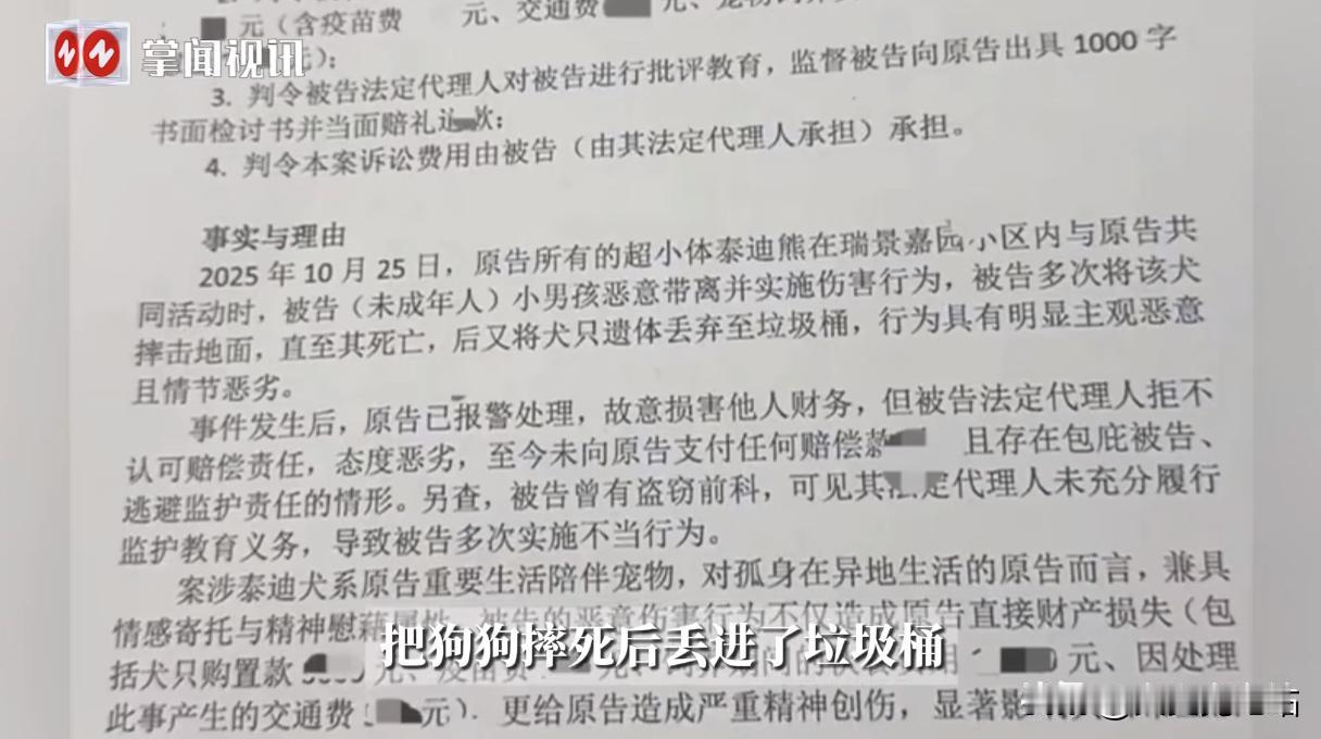 悲剧还是发生了!10月25日,浙江温州,一女子带着自己2岁的泰迪犬出门,谁知却被一个小男孩把狗偷走,接着男孩将狗摔死后又丢进了垃圾桶,女子崩溃不已要求赔偿5000多元,可小男孩父母却只愿意赔偿2000元,网友:孩子还是要从小严格教育! 10月25日,温州一名女子带着养了两年的泰迪犬出门,小狗体型不大,她觉得没必要牵绳,没想到就在这短短的时间里,一个小男孩把狗抱走了,最后竟然把狗摔死扔进了垃圾桶。 女子找到男孩的父母要求赔偿,她说这只泰迪当初买的时候就花了5000元,养了两年感情深厚,现在狗没了,怎么也得按购买价格赔。但男孩父母只愿意出2000元,双方谈不拢,最后闹到了法院。 这事其实两边都有问题。女子出门遛狗没牵绳,这本身就违反了养犬管理规定,现在很多城市都明确要求,带狗出门必须系牵引绳,不管狗大小,就是为了防止狗走失或者伤到别人。 宠物属于个人财产,别人故意弄死你的狗,确实需要赔偿,具体赔多少,要看狗的实际价值,如果能证明当初买的时候确实花了5000元,那按这个价格赔也说得过去。 但男孩这边的问题更严重,不管出于什么原因,把别人的狗抱走摔死,这是明显的侵权行为,小孩做错事,父母作为监护人必须承担责任。这不是说赔点钱就完事了,关键是要让孩子明白自己错在哪。 有人可能会说,小孩不懂事,做错事很正常,但摔死一条狗,这已经不是普通的淘气了,这种对生命的漠视,如果不及时纠正,长大后可能会造成更严重的问题。 父母在日常生活中,应该教孩子尊重生命,不管是人还是动物,看到小动物不能随便去抓,更不能伤害它们,如果孩子真的喜欢小动物,可以征得主人同意后,在安全的前提下摸一摸。 这起事件也给所有养狗的人提了个醒,遛狗不牵绳,看起来省事,其实隐患很大,狗走失了是小事,万一咬到人或者引发交通事故,后果不堪设想。 牵引绳不贵,也不麻烦,,出门前套上,既能防止狗走失,也能让周围的人更安心,尤其是在人多的地方,牵着绳子能更好地控制狗的行动。 对于怕狗的人来说,看到有人遛狗不牵绳,心里肯定会紧张,虽然你知道自己的狗温顺,但别人不知道啊,牵上绳子,是对他人的尊重,也是对自己狗的保护。 这次事件最终会怎么判,还得看法院的裁决,但不管结果如何,这都是一个教训,女子失去了陪伴两年的爱犬,男孩和家长也要承担相应的责任和赔偿。 这事儿看得人又气又心疼!一边是当“家人”养的泰迪被摔死,主人崩溃索赔;一边是熊孩子下手狠辣,家长态度还差。 “熊孩子背后必有熊家长!” 不少人怒斥男童家庭教育缺失:“偷狗、虐杀、扔垃圾桶,一套操作行云流水,这娃心里住着魔鬼吗?家长之前不管教,现在出事还护短,赔钱都是轻的!” 有网友补充细节,称男童曾有盗窃前科,家长却一贯纵容,如今酿成大祸才追悔莫及,有人直言:“现在不教,将来社会替你教,但代价可能是一条命甚至更严重!”  “遛狗不牵绳,主人活该吃亏?” 支持此观点的人认为,主人责任不可推卸:“法律明文规定遛狗必须牵绳!要是绳子拴紧了,孩子能轻易抱走狗吗?” 有人以杭州类似事件举例:未牵绳的泰迪追吓小孩被老人摔死,网友评论两极分化,但多数人认为“绳子是宠物的保命绳”。 不过也有人反驳:“即使没牵绳,狗不该被判死刑!孩子的恶意行为不能甩锅给主人疏忽。” “赔偿5000元多不多?精神损失怎么算?” 关于赔偿金额,网友算了一笔账:“如果是纯种泰迪,市场价5000元不夸张,但法律一般只认实际财产损失,精神赔偿?除非主人能出具心理治疗证明,否则难支持。” 还有人吐槽家长:“赔2000元就想打发?狗主人的情感投入远超这个数!家长的态度摆明是想敷衍了事。”  虐动物行为会不会升级? 最让人脊背发凉的是男童的动机——监控显示他反复摔狗,竟称“觉得好玩”。网友联想起心理学研究:“虐待动物往往是暴力倾向的前兆,家长再不干预,未来可能对社会造成更大危害!” 也有人呼吁立法:“我国急需反虐待动物法,否则这类事件只会重复发生!”  “养宠人要牢记牵绳、清便、避让老幼;家长则需教会孩子敬畏生命,一起悲剧两面镜,社会文明靠双方共建。”有人建议社区加强宣传,比如推广“宠物友好公约”或设立遛狗专区,避免人宠冲突。 若您是小区的旁观者,会更支持哪一方?你觉得如何才能从根本上避免此类悲剧?是严惩虐宠行为,还是该从重处罚不文明养犬人?欢迎在评论区留下你的观点!  信息来源:篝火视频