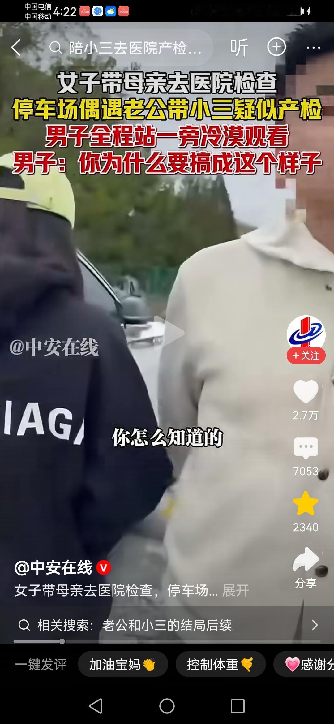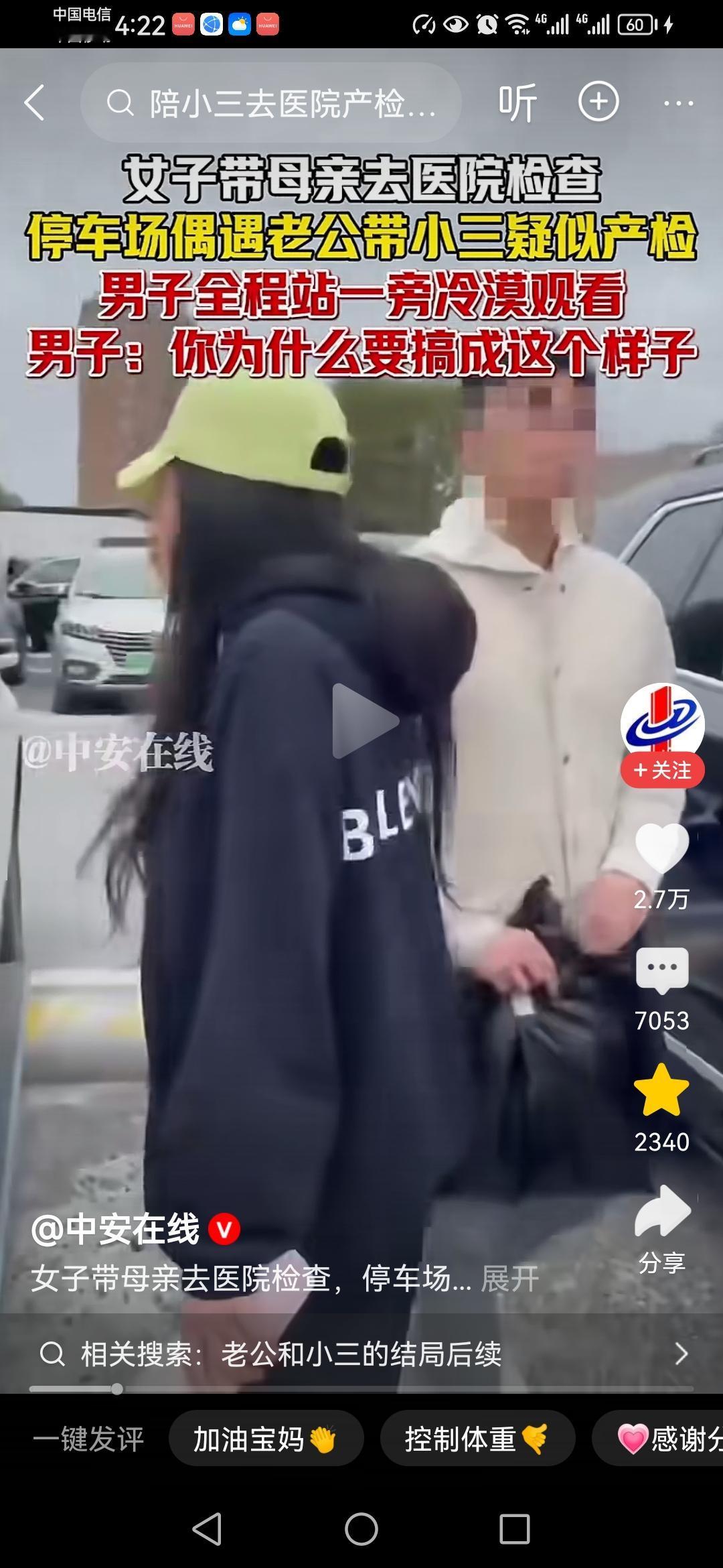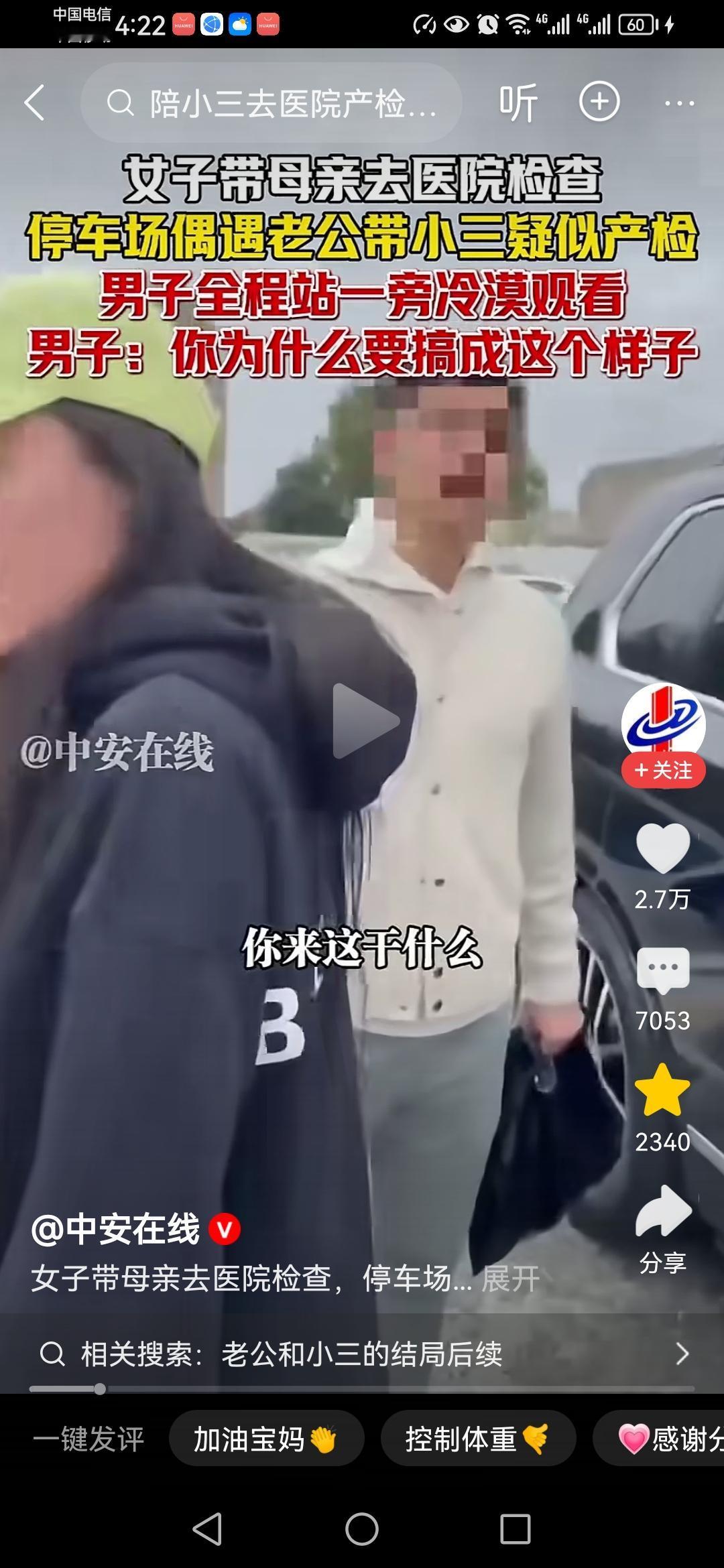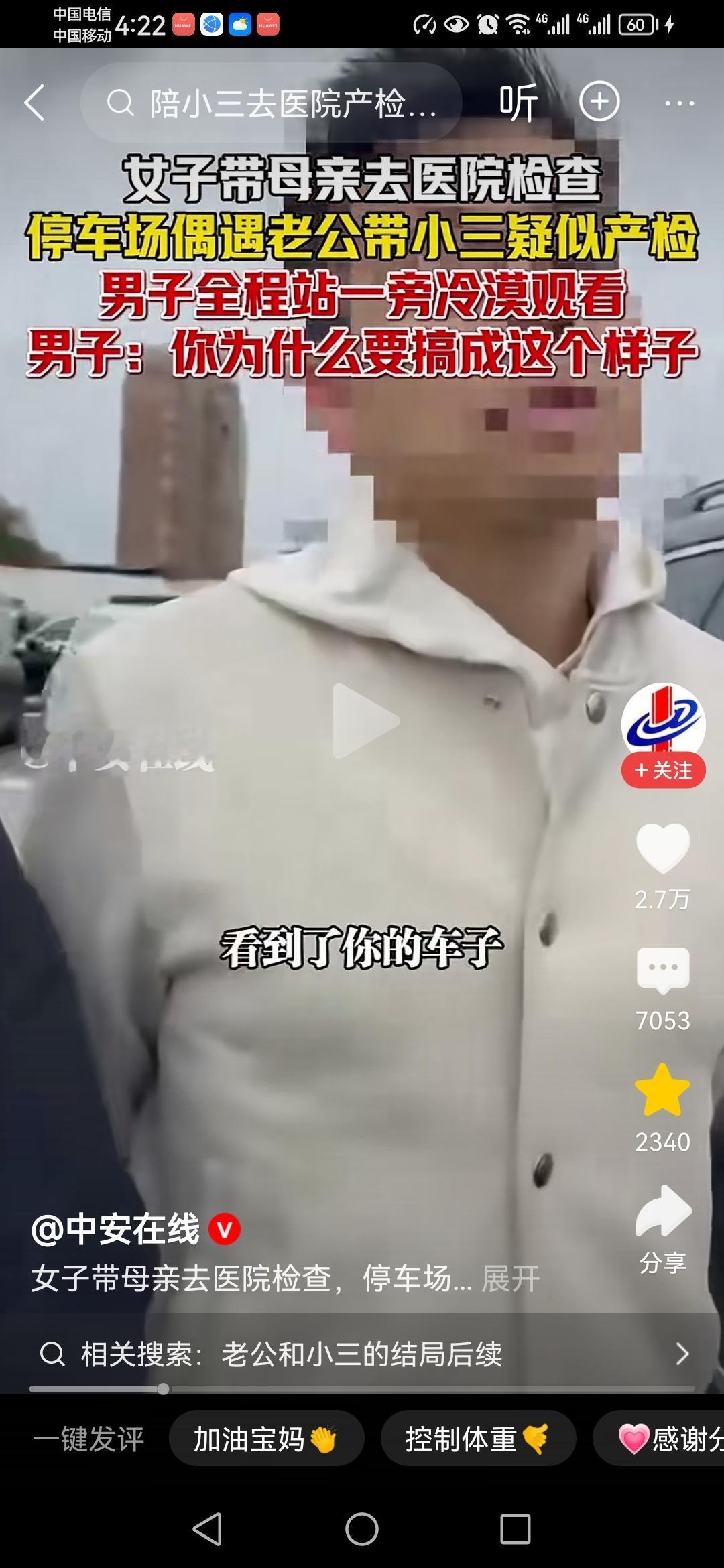 实在是太炸裂了! 上海一女子陪自己的母亲到医院去看病,偶然发现自己老公的车子。于是过去看看怎么回事,想不到是自己的老公带着刚刚怀孕的“另外一个女子”,来到同一家医院进行产检! 面对女子的步步追问,他的老公全程冷漠,女子一再追问,另外女子全程捂着自己的脸,一句话也不敢回应! 在这个事情上面,女子保持着非常的克制,问了她老公三个问题。 一,到底有没有怀上,一再追问,老公回答“怀上了,又怎么啦”! 二,另外女子到底比她哪里好了,老公回答就是比你好。 三是,她问另外一个女子,这样一个对家庭不负责任,对孩子不负责任,对老婆不负责任的人,怎么可能相信得过! 面对自己太太的质问,男子反问究竟怎么搞成这样!
