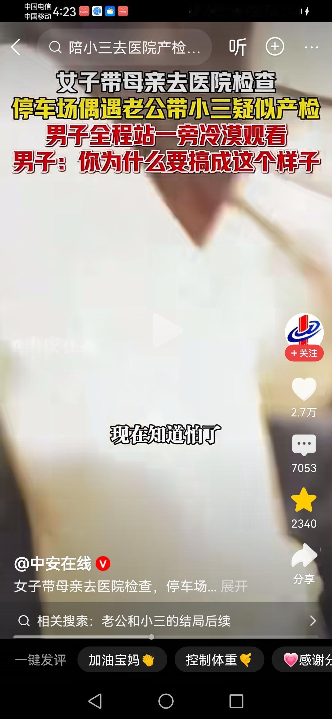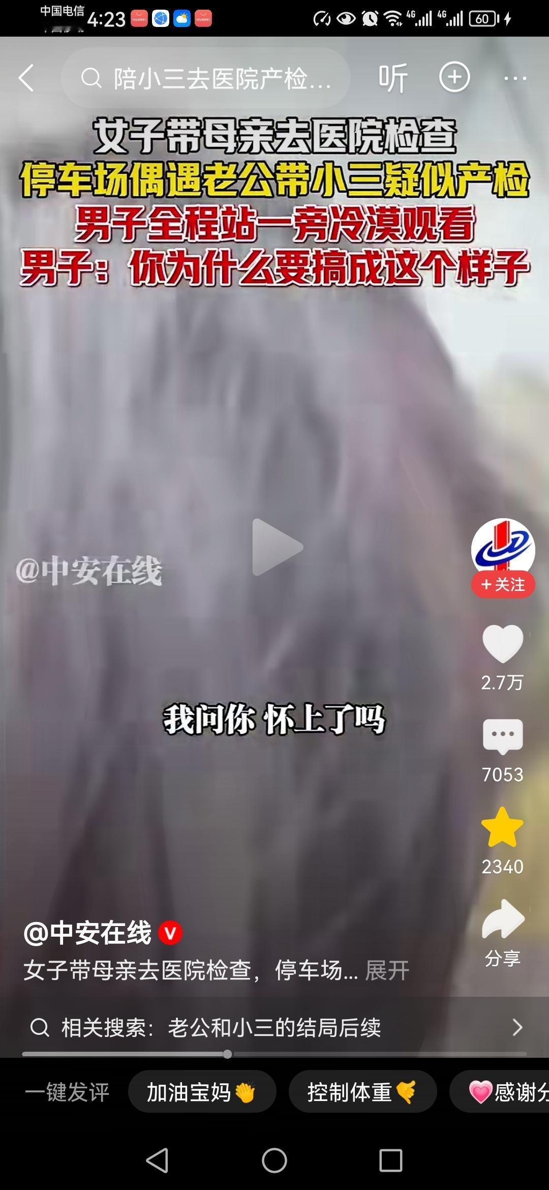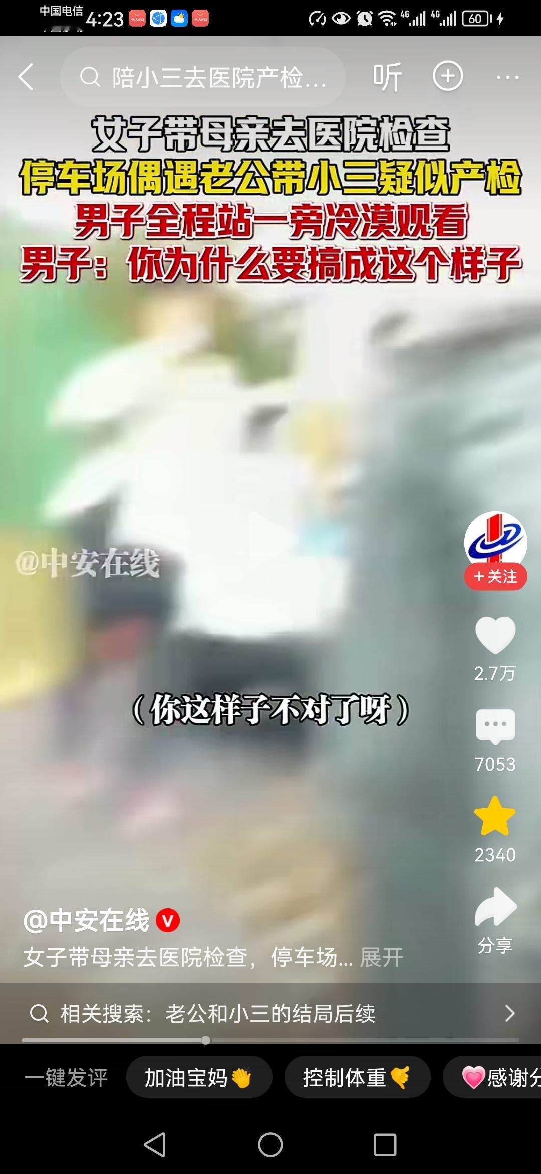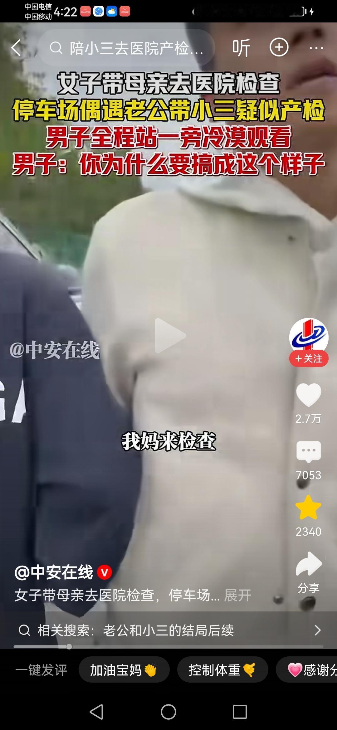 实在是太炸裂了! 上海一女子陪自己的母亲到医院去看病,偶然发现自己老公的车子。于是过去看看怎么回事,想不到是自己的老公带着刚刚怀孕的“另外一个女子”,来到同一家医院进行产检! 面对女子的步步追问,他的老公全程冷漠,女子一再追问,另外女子全程捂着自己的脸,一句话也不敢回应! 在这个事情上面,女子保持着非常的克制,问了她老公三个问题。 一,到底有没有怀上,一再追问,老公回答“怀上了,又怎么啦”! 二,另外女子到底比她哪里好了,老公回答就是比你好。 三是,她问另外一个女子,这样一个对家庭不负责任,对孩子不负责任,对老婆不负责任的人,怎么可能相信得过! 面对自己太太的质问,男子反问究竟怎么搞成这样!