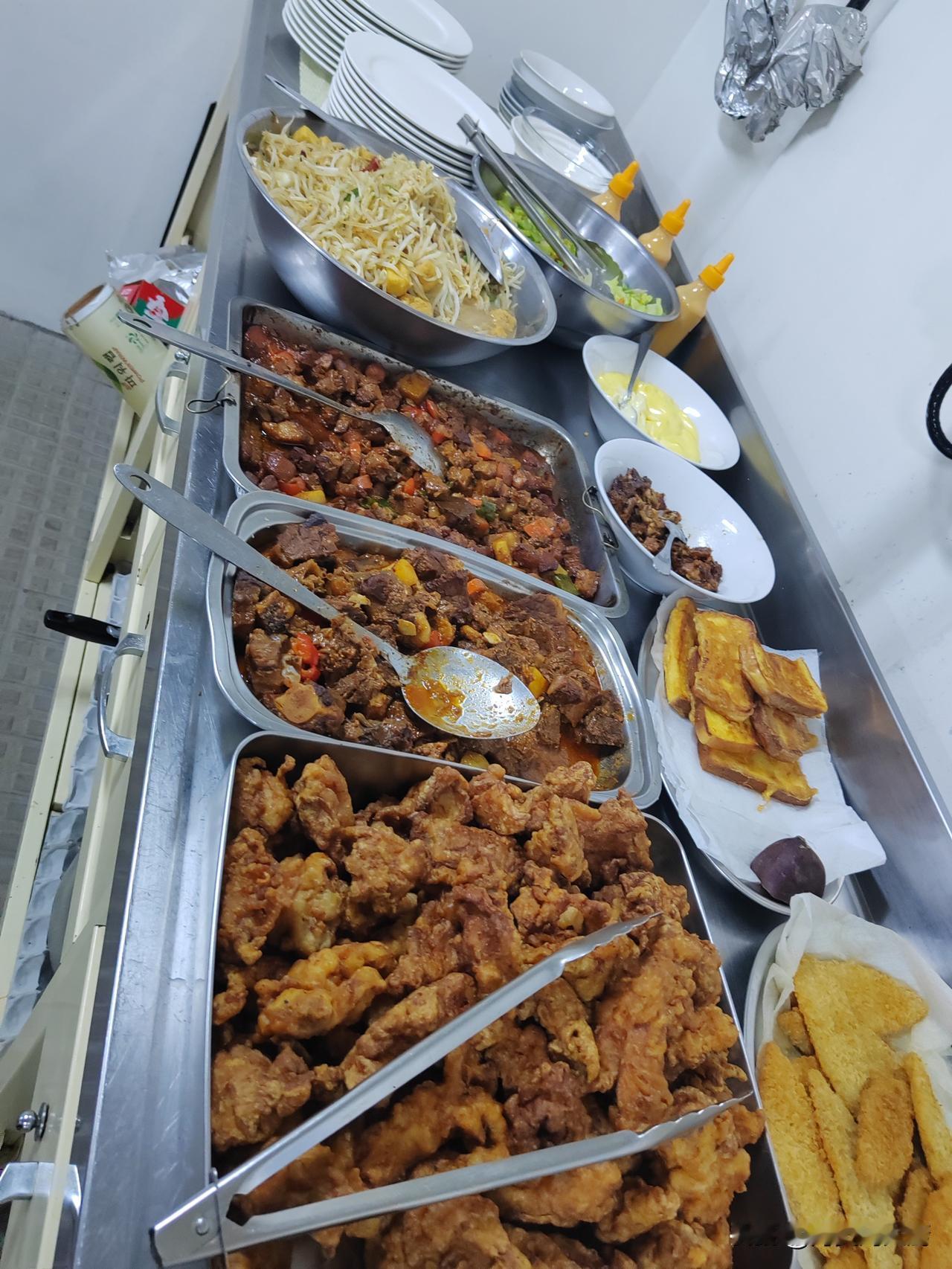 3点多钟到了船上,我就赶紧到厨房看了看,大厨正在忙活,由于我英文不好,没法和菲律宾大厨交流,就从手机软件上简单的交流了几句,他把干货库房的门打开,让我看了看,好多的国外调料啊! 由于我今天刚上船,还没有交接班,今天的饭菜还是由菲律宾大厨做,我也一饱口福了,吃一顿西餐,尝一下菲律宾美食,听大台说这条船吃饭属于自助,不实行分餐制,大厨把菜炒好后放到不锈钢盘子里,到了吃饭的时间,船员自己盛菜,想吃什么就盛什么,我问了一下大台,分餐制会不会出现好吃的菜不够吃,不好吃的菜,会剩下?这种局面,大台说确实是这样,因为这条船上有好几个船员忌口,有不吃牛羊肉的,有不吃猪肉的,感觉自助会比较合适一些。 下图就是今天的晚餐。