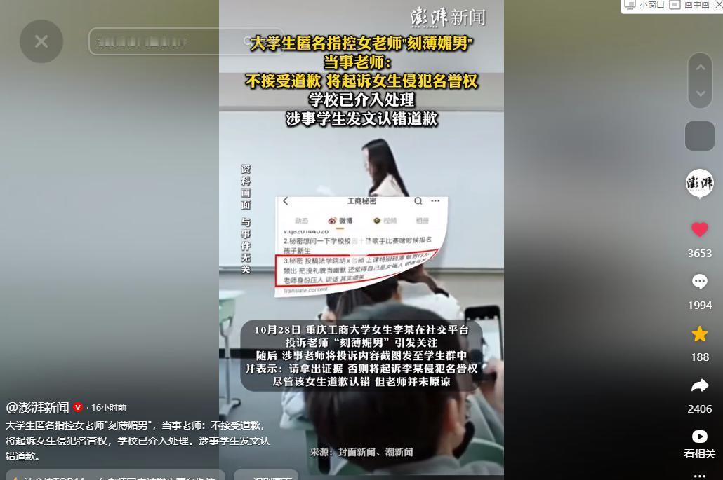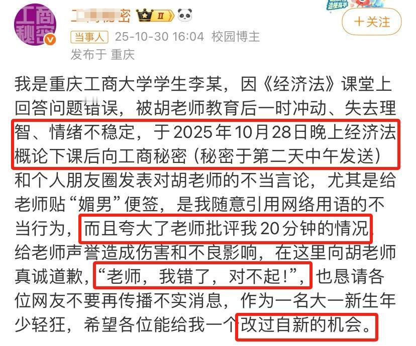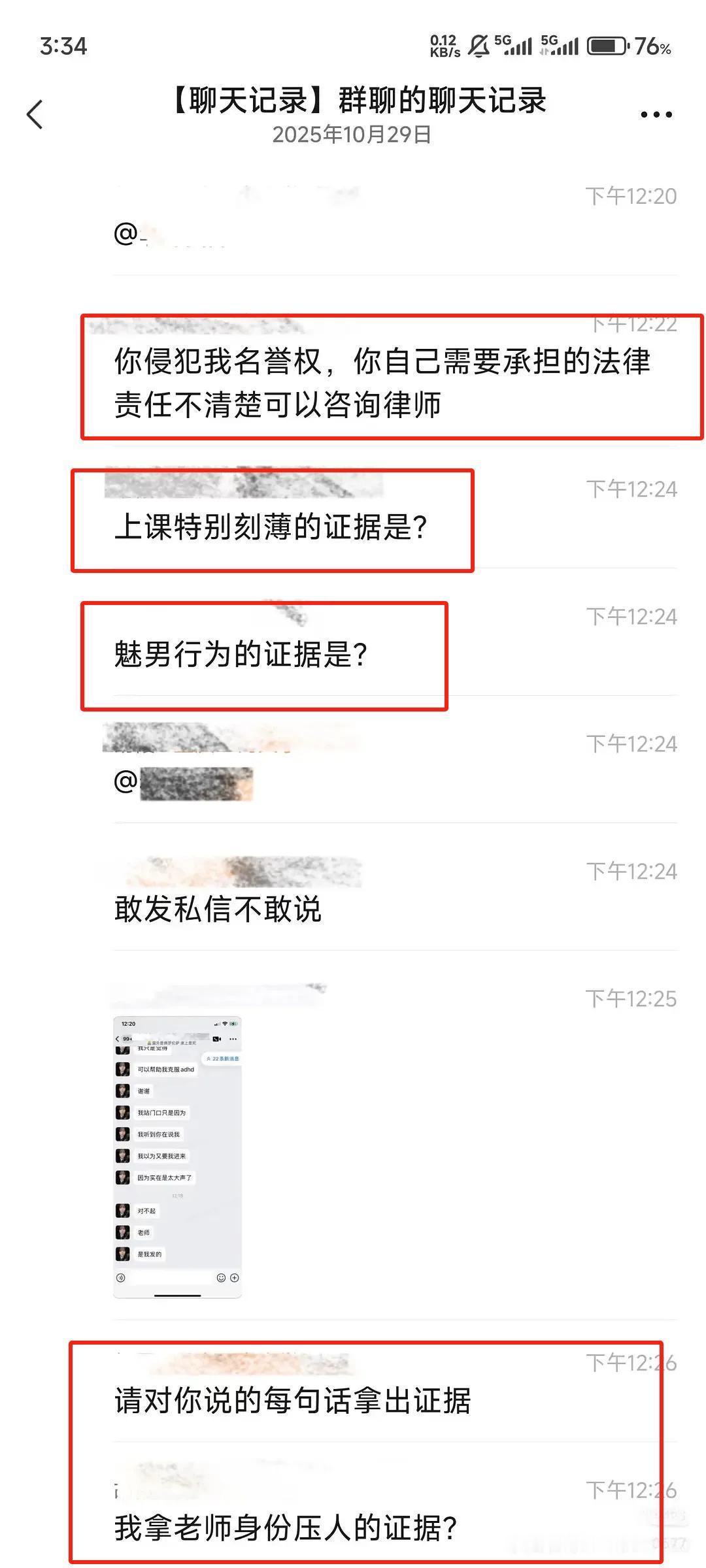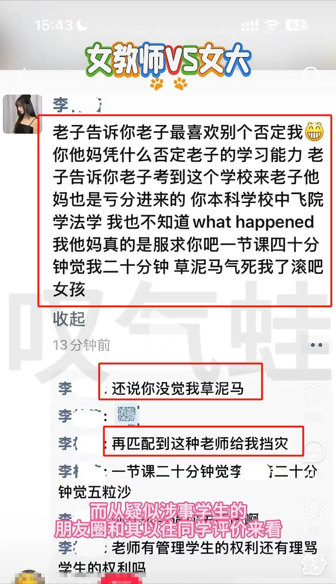 女大诋毁老师后续:原因曝光太离谱,老师已心寒,决定硬刚到底 假如说网上那些网暴学校和老师的事件中,学校和老师都能拿起法律武器来保护自己,“有关部门”也不要抹稀泥,或者动不动就打压老师,我们的教学环境会好许多。 支持这位老师,如果师德有问题,有无数的学生和领导同事可以见证,有规章制度可以惩罚。如果是学生自己品行不端,还随意网上造谣,诋毁老师,也应该得到学校和法律的严惩。 这样的学生很多,只是老师大多忍气吞声,如果每个被网暴者都能勇敢地用法律反击就太好了