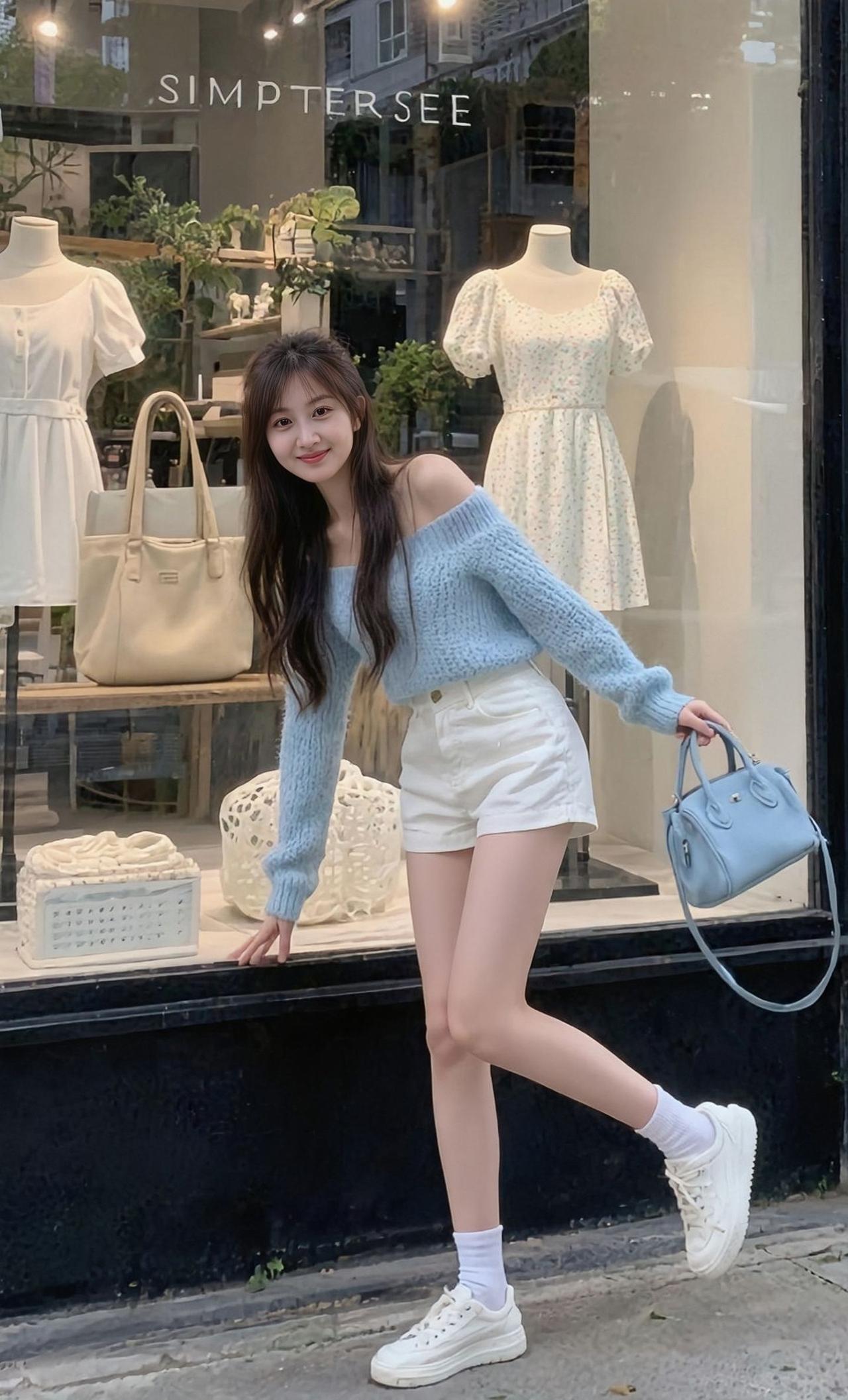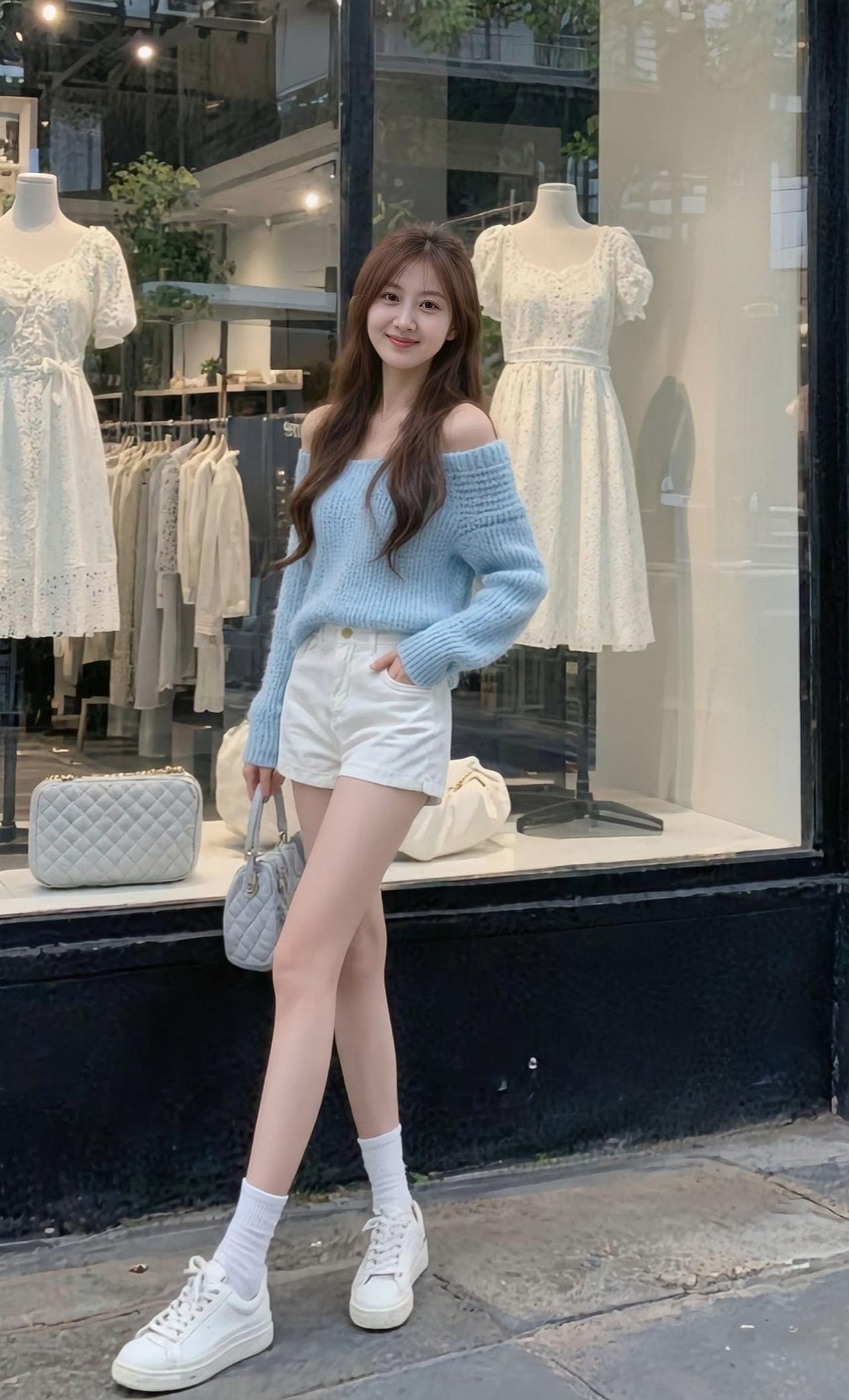 夏日穿搭指南:清新蓝毛衣+白色短裤,元气满满!🌞👗👟