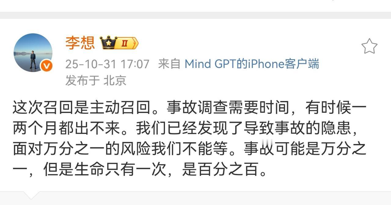 花巨资补救,没有任何掩饰,李想谈理想MEGA 2024款主动召回,提到了“生命只有一次”,万分之一的故障概率对生命来说也是“百分之百”。本来,这是车企应当做到的基操,现在却值得再细品一下。 召回原因公开,非常清楚明了,是什么就是什么,不粉饰为“免费升级”,点赞! 召回原因:由于冷却液防腐性能不足,特定条件下会导致冷却回路中动力电池和前电机控制器的冷却铝板腐蚀渗漏,导致车辆出现故障灯点亮、动力受限及无法上电的情形,极端情况下会造成动力电池热失控,存在安全隐患。 公司高层强调"先看是否符合价值观,再考虑成本"。这样的车企,虽然出了问题,价值观只要正,不玩套路,不矮化车主为信徒,大家就愿意支持下去。 解决方案(成本很高): 免费更换冷却液、动力电池和前电机控制器; 动力电池延保至10年或20万公里; 优化云端预警系统,提前识别风险。 难怪《半月谈》将李想的真诚沟通行为列为正面典型。暂时遇到很大困难,这样的企业也总会柳暗花明。