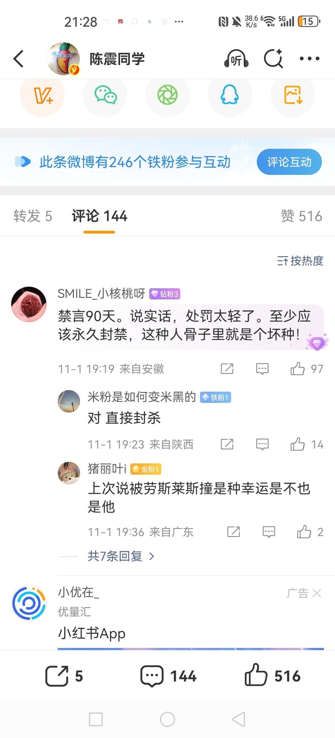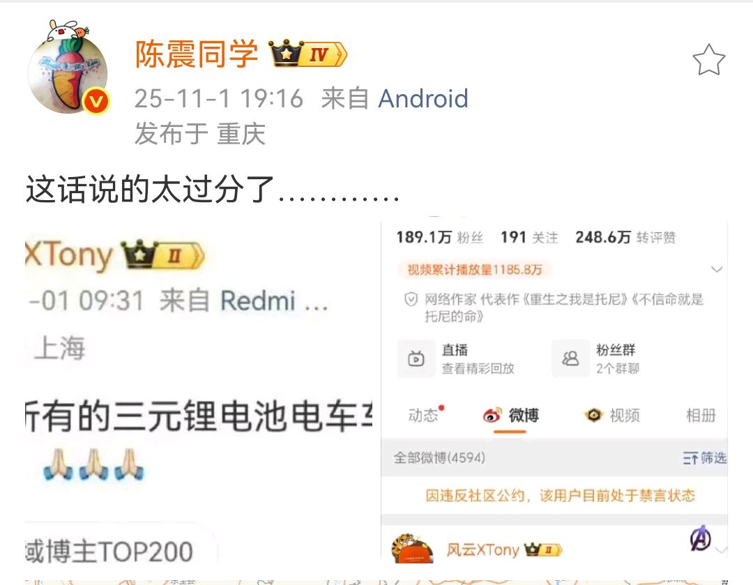 陈震:说的太过分了…… 这个人90天的禁言,但是绝大多数人都认为这个人该封杀,他上次说的一句话是“被劳斯莱斯撞是一种幸运”,然后被禁言了一段时间。 现在又跳了出来说这种话,其实这个话已经不是单纯的攻击某个品牌了,这直接是针对所有开三元锂电动车的车主呀。 各位是怎么看的?欢迎评论区留言。