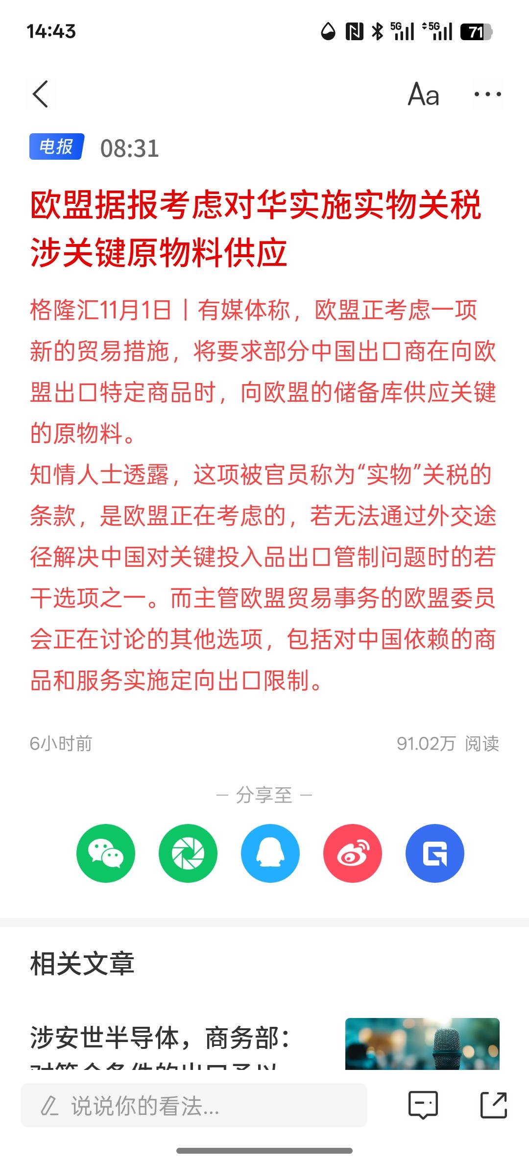 欧盟据报考虑对华实施实物关税涉关键原物料供应,欧洲又开始整活了!那中国对欧洲的稀土管制会更加严苛!欧洲车厂目前有些车企开始停产!安世半导体问题如果没办法解决,欧洲更是困难重重!欧洲还想对中国施加压力吗?