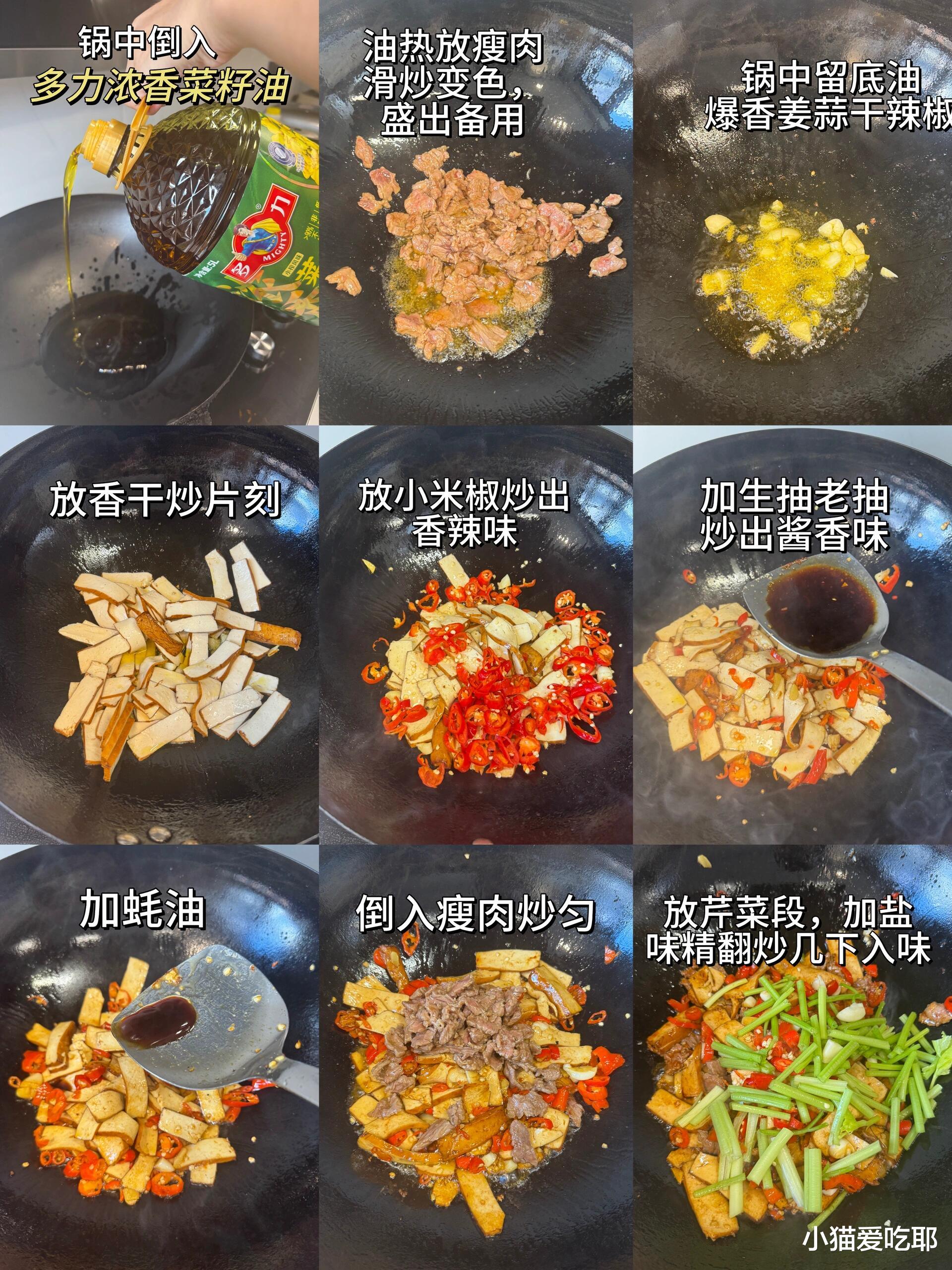 先来唠唠食材吧。这可都是些常见的家常好物,没啥稀奇的,但组合起来就妙不可言啦。主角自然是香干,那嫩嫩的口感,吸满了汤汁后,每一口都让人停不下来。瘦肉嘛,一定要挑新鲜的,切成薄片,这样炒出来才能又嫩又滑。还有小米椒和干辣椒,是这道菜的灵魂所在,辣味刚刚好,既能刺激味蕾,又不会让人觉得难以承受。芹菜也是必不可少的,它那清新的味道,能中和肉的腻,还能给整道菜增加一丝脆爽。姜蒜就更不用说了,是厨房的调味小能手,少了它们,这菜就会失色不少。