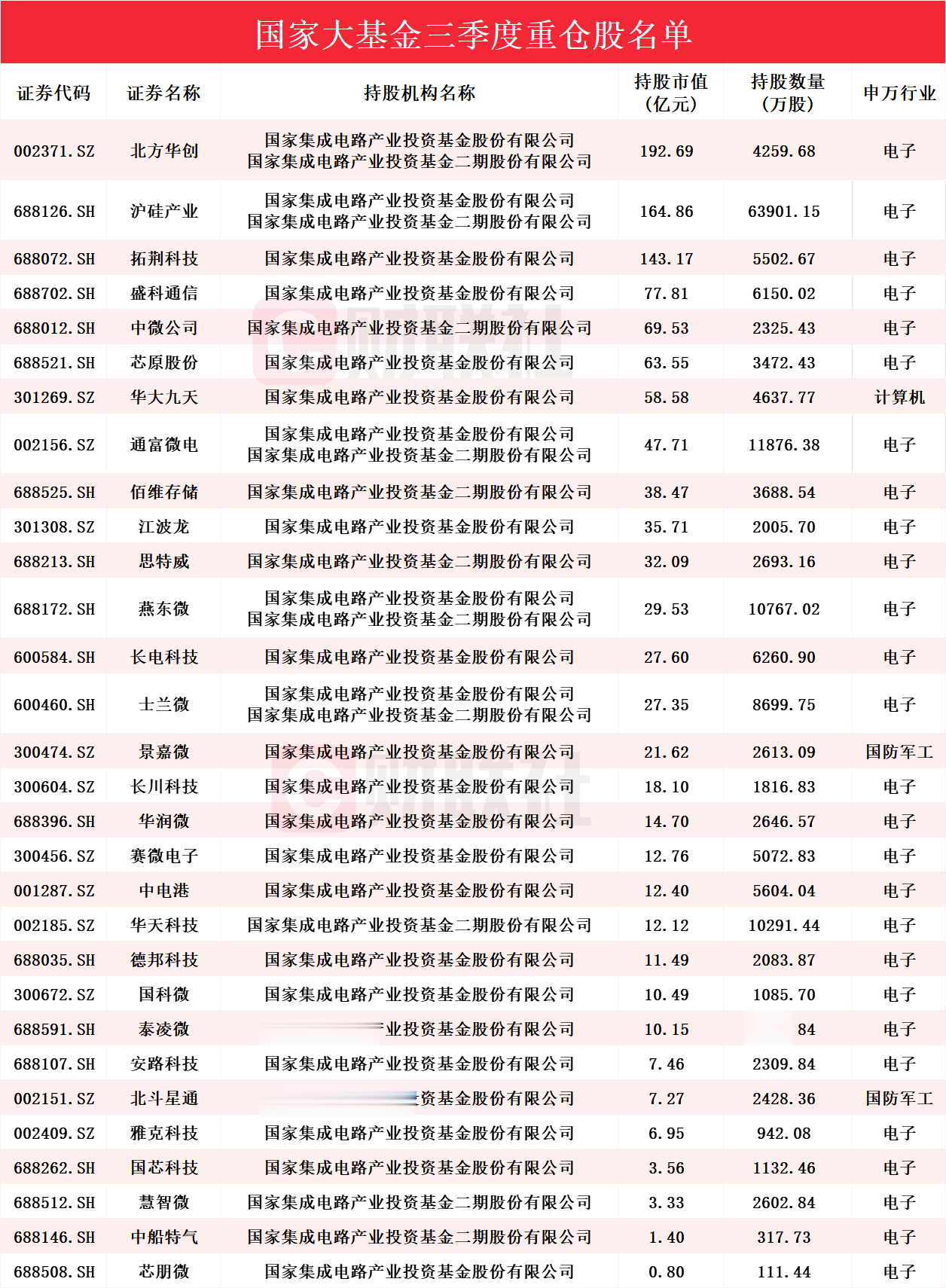 具体来看,主要产品是电子工艺装备、电子元器件的北方华创三季度获得“国家大基金”持仓市值达192.69亿元。根据北方华创三季报披露,北方华创获国家集成电路产业投资基金股份有限公司、华芯投资管理有限责任公司-国家集成电路产业投资基金二期股份有限公司重仓持股,分别位列公司十大流通股东第四和第七席位。北方华创10月30日发布2025年第三季度报告,第三季度营收为111.60亿元,同比增长38.31%;归属于上市公司股东的净利润为19.22亿元,同比增长14.60%。前三季度营收为273.01亿元,同比增长32.97%;归属于上市公司股东的净利润为51.30亿元,同比增长14.83%。业绩增长主要得益于国内集成电路装备市场需求持续增长,公司凭借高效的研发能力和快速的客户响应,工艺覆盖度和市场占有率稳步提升,市场份额扩大带动营业收入增加。