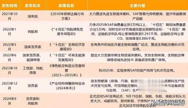 2023年10月,工业和信息化部、科技部、财政部、民航局联合印发《绿色航空制造业发展纲要(2023—2035年)》提出:到2025年,实现使用SAF的国产民用飞机示范应用。