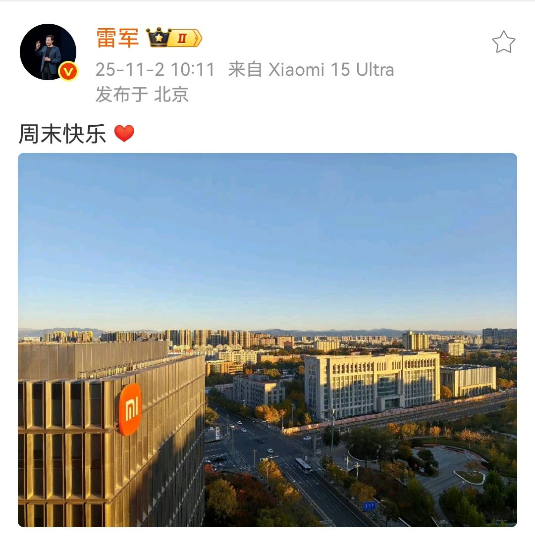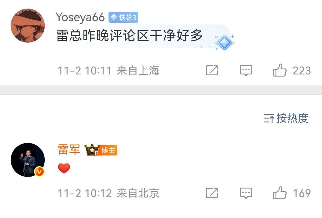 雷军:周末快乐! 网友:雷总昨晚评论区干净好多! 雷军:❤️ 不知道雷军发这个爱心是什么意思?反正这几天小米也没有太大的新闻,雷军发文也没有那么密集了。 雷总是企业家中的超级大网红,他的一言一行都受到网友们的关注。各位是怎么看的?欢迎评论区留言。