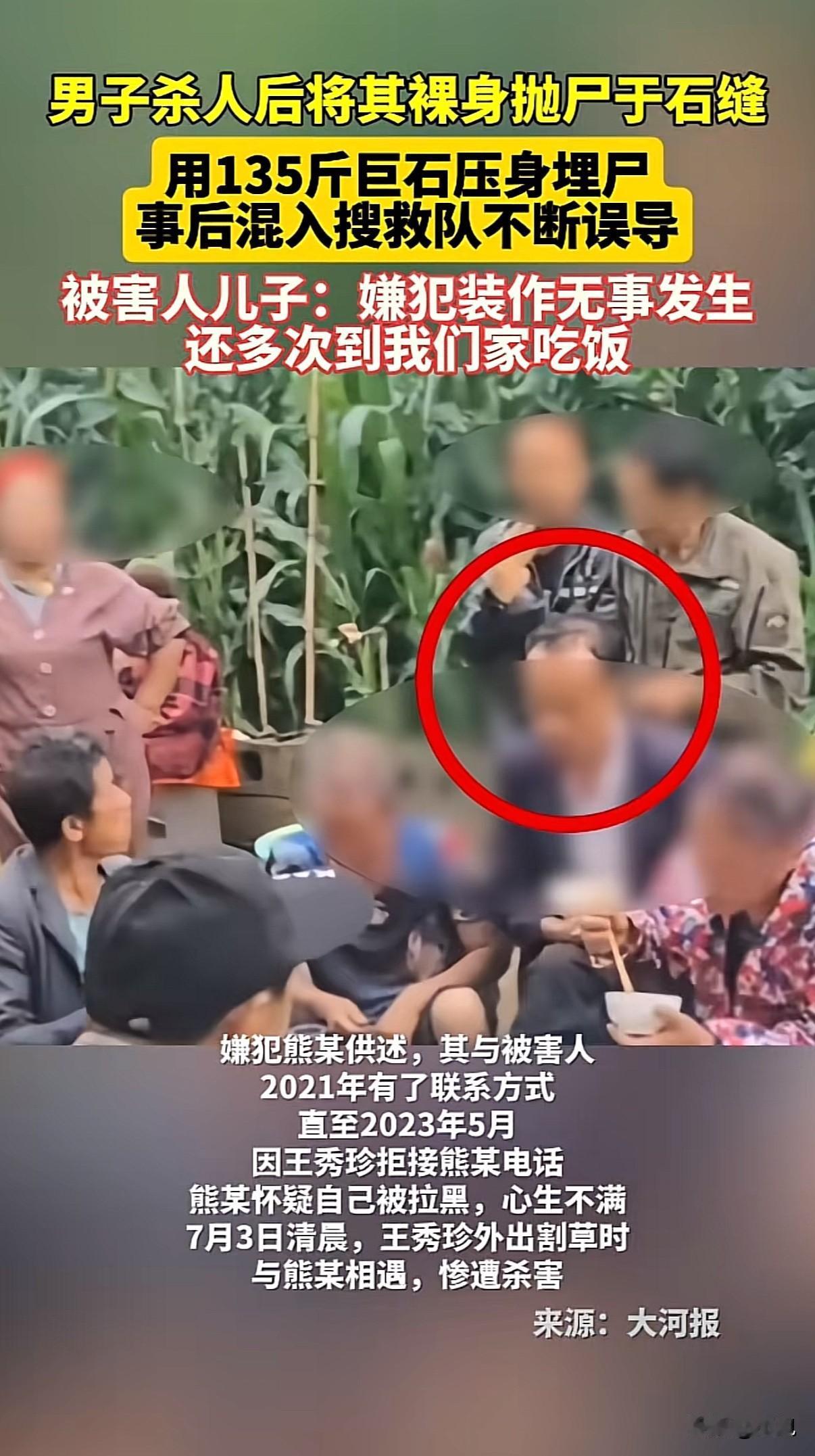 “男子杀人后淡定去被害人家吃饭”!一个叫熊某的男人,杀了同村妇女王秀珍后,还能天天去受害人家吃饭,跟着家属一起找人,整整演了一个月戏。 两家距离不到三百米,受害者儿子一直叫他"伯伯"。就因为王秀珍不接他电话,他怀疑被拉黑,就起了杀心。 2023年7月3日早上,王秀珍去地里割草。熊某遇到她,从她背篓里拿出尼龙绳,从背后勒住她脖子。王秀珍倒地后,他怕没死透,又勒了整整三十分钟。 法医后来鉴定,舌骨都勒断了。 杀人后,他异常冷静。先把自己筐里的草割完才离开。晚上九点返回现场,把尸体衣服脱光,扔进山间石缝,搬来两块巨石压住——一块108斤,一块153斤。 接着他分三次烧死者的衣物、背篓和作案工具。 第二天,他还把死者的镰刀放回她家门口,制造离家出走假象。 更让人发指的是,案发第二天,他在短视频平台发了条唱歌视频,配文是"你离开以后……"。 搜寻期间,他天天到受害者家"帮忙",一起吃饭喝酒,甚至参加为寻人举办的法事。有次和受害者儿子在埋尸的垭口附近相遇,他面不改色。 破案关键很有戏剧性。家属请道士做法事,道士突然说:"尸体被石头压着,一周内破案。" 这话让熊某坐立不安。大家凑近看道士做法时,他独自躲得远远的。加上警方发现受害者手机曾短暂开机,定位就在她家附近,这才锁定他。 被抓后,他带警方找到尸体。就因为这点,二审法院认定他"认罪悔罪",判了死缓,限制减刑。 但家属想不通:这算真悔罪吗?他是因为道士的话害怕才交代的。作案后那么冷静地伪装现场、发挑衅视频,哪像悔罪? 现在家属已申请再审,要求改判死刑立即执行。贵州省高院今年9月已立案。 法律讲证据,这没错。但如此残忍的作案手段,加上事后极端冷静的伪装,确实挑战普通人的正义观。 凶手带警方找尸体,到底是真的悔过,还是知道躲不过了想减刑?这个问题,或许就是再审需要弄清楚的。 司法需要严谨,但也不能背离常人对公平的基本认知。相信法律最终会给出一个让公众信服的判决。 这起案件提醒我们,有些人性的阴暗面,确实超乎想象。但正义不会缺席,只是需要时间。