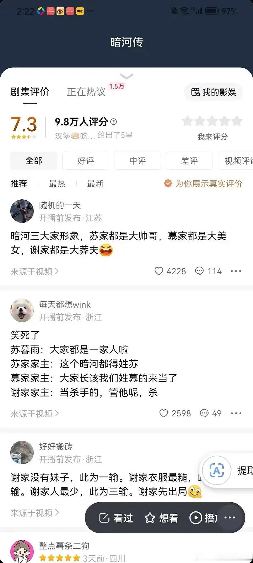 三宝抖开分,水龙吟7.5分,暗河传7.3分,天地7.3分。