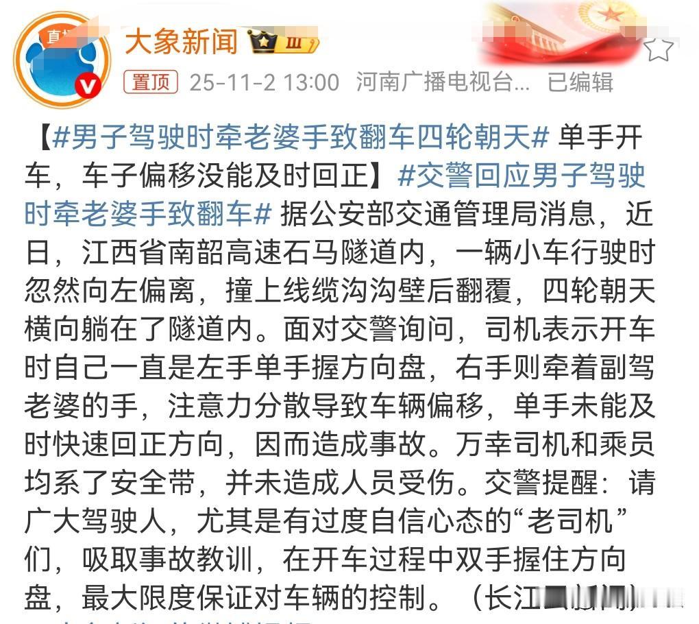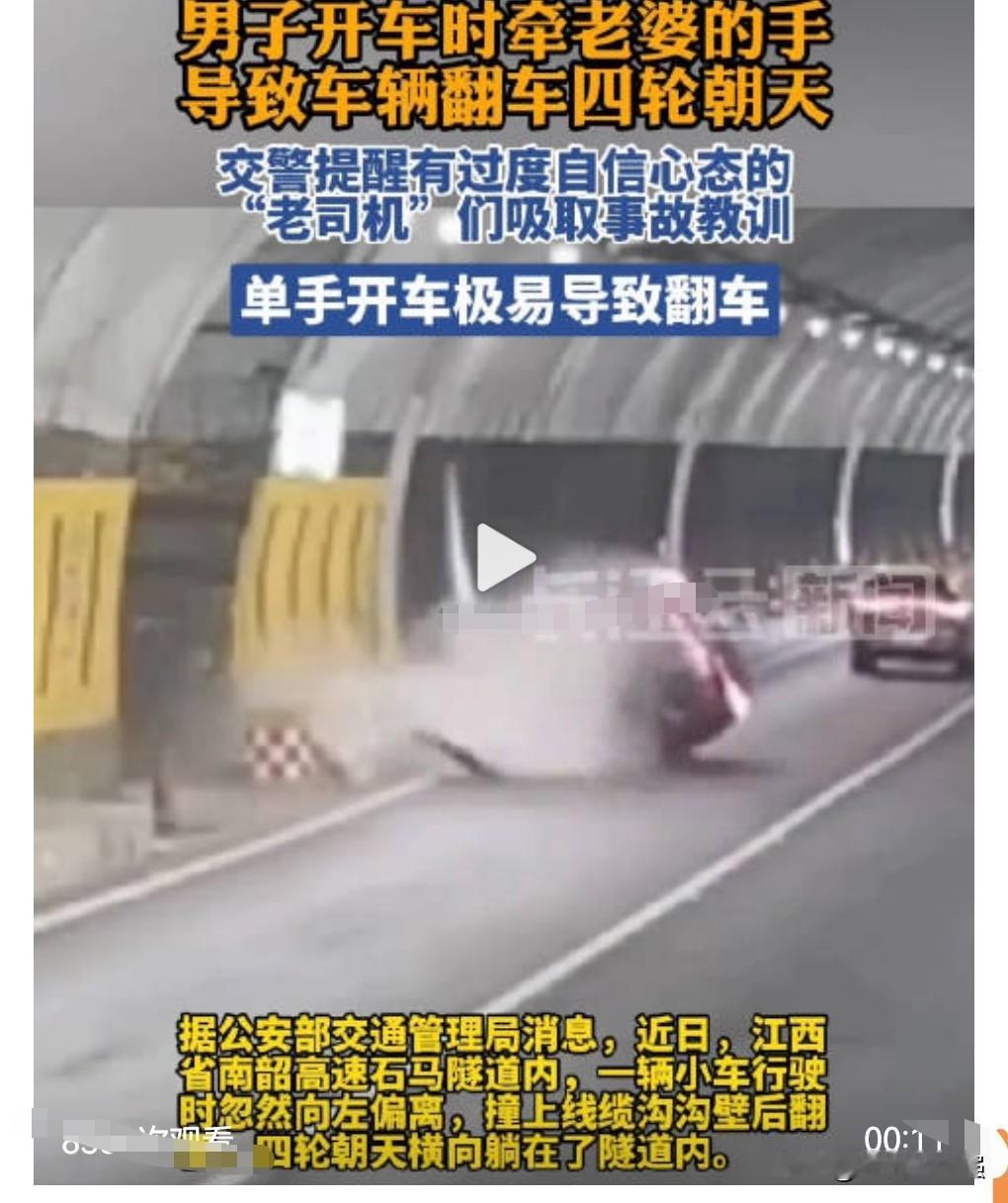 这男子也太爱他老婆了吧,开车的时候都还牵老婆的手。 近日,男子驾驶时牵老婆手致翻车四轮朝天,幸亏这两个人系了安全带,没有造成人员受伤。 但凡没系安全带,就是另外一个悲伤故事了。 开车的时候一定要注意安全,不要三心二意。 就这个情况应该给予处罚,不遵守交通规则。