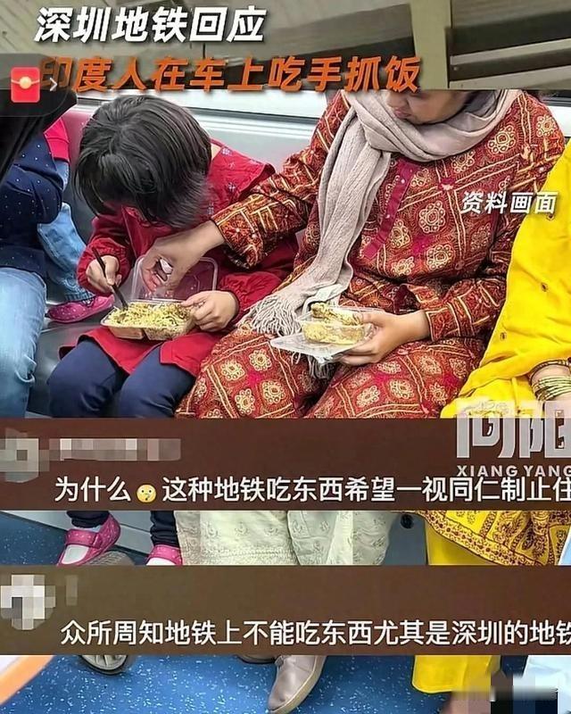 印度人深圳地铁上吃手抓饭后续来了, 地铁巡查人员看到后居然不制止, 10月26号有网络视频显示印度女子, 穿着印度传统服饰乘坐深圳地铁, 居然直接在地铁上开始吃手抓饭, 弄得车厢里面都是咖喱味, 车厢的乘客都愤怒不已, 刚好有地铁工作人员巡检看到了, 居然装作没看见也不制止, 大家都知道地铁车厢是不让吃东西的, 为什么印度女人可以吃, 工作人员为什么不制止, 一时间质疑声直冲网络, 深圳地铁客服一会说会反馈, 一会说那印度女子是在工作人员离开后才吃的,对老外也会一视同仁, 这也太好搞笑了吧! 这不就是妥妥双标吗? 大家对于深圳地铁这样的回应怎么看? 地铁提速生活 深圳地铁 印度网红上海行 印度人吃法