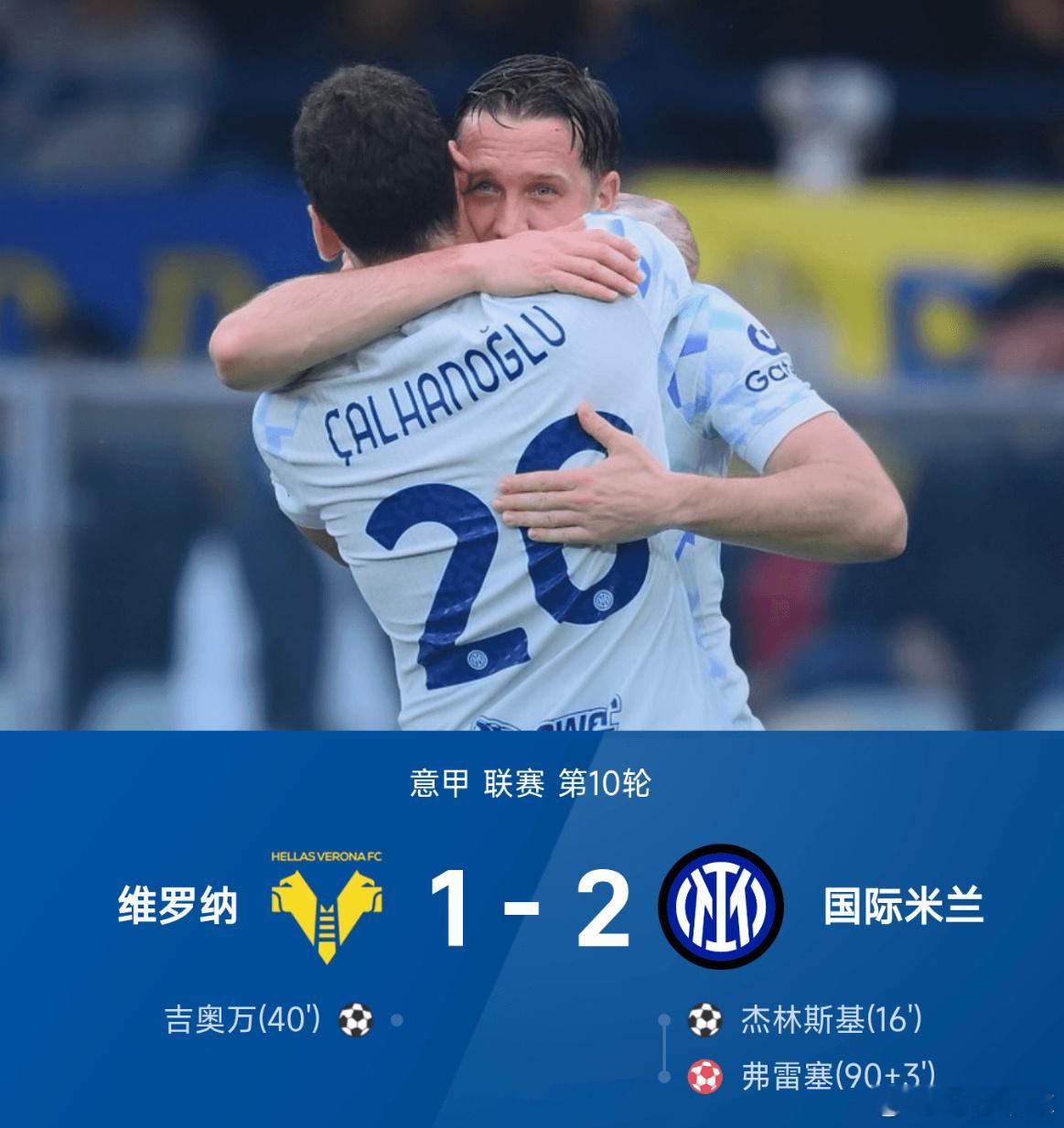 11月02日讯 25/26赛季意甲联赛第10轮,国际米兰2-1战胜维罗纳。上半场比赛,恰尔汗奥卢战术角球助攻泽林斯基破门,上半场结束前吉奥万抽射破门扳平比分。下半场易边再战,比塞克飞铲对手但逃过红牌,弗雷塞最后时刻自摆乌龙帮助国米绝杀赢球。国际米兰国际米兰vs维罗纳
