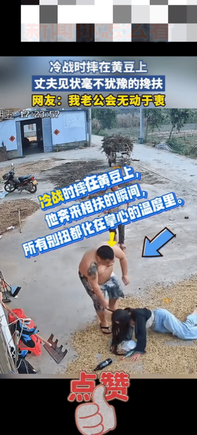 冷战时她摔在黄豆上,老公那个动作破防了…… 浙江院子里的这场冷战,被一把黄豆搅了局。 女人提着黑袋子往外走,路过坐在板凳上的老公,眼皮都没抬一下。男人光着膀子,刚干完活,看着她径直踩过院里晾晒的黄豆——那片金黄的豆子,平时晒得干透,此刻成了“绊脚石”。 “哎哟”一声,女人脚底一滑,结结实实摔在豆子堆里,半天没爬起来。 男人先是僵了两秒,像被按了启动键似的,猛地从板凳上弹起来,几步冲过去扶她。没说一句话,只是攥着她的胳膊往上拉,掌心的温度透过衣袖传过去。 刚才还紧绷的空气,好像随着这个动作松了劲。冷战时的沉默、别扭,在他伸手的瞬间,悄悄化了。 有网友说,这一扶,比道歉管用;也有人笑,自家那位怕是会先憋笑再伸手。 婚姻里的坎,有时就像那堆黄豆,看着平常,却能让人猝不及防摔跤。但摔下去时,有人第一时间奔过来的样子,才是日子里最实在的暖。 你家那位,在你“出状况”时,会是啥反应?评论区聊聊~ 夫妻冷战的破防瞬间 婚姻里的小温暖夫妻吵架感悟 婚姻家庭冷战