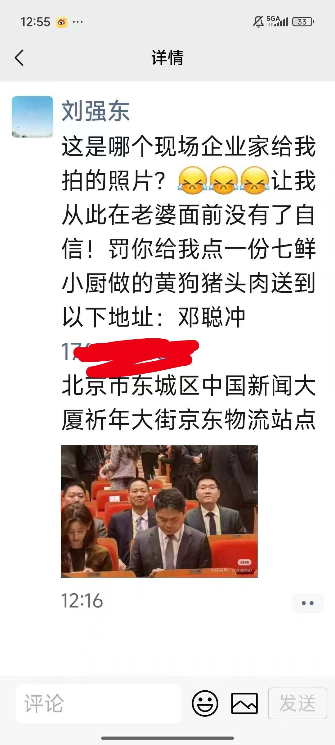 刘强东说这组照片让自己从此在老婆面前没有了自信,罚网友给他点一份外卖,然后这个外卖员邓聪冲现身说法,说收到好多网友下单送来的黄狗猪头肉,已经发动周边所有骑手兄弟们一起来吃了,实在太多,吃不完。