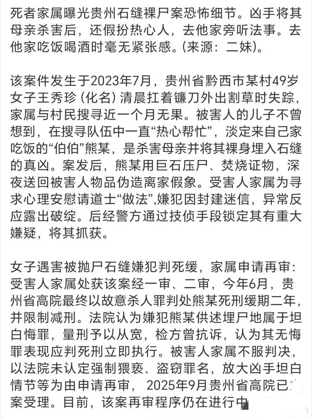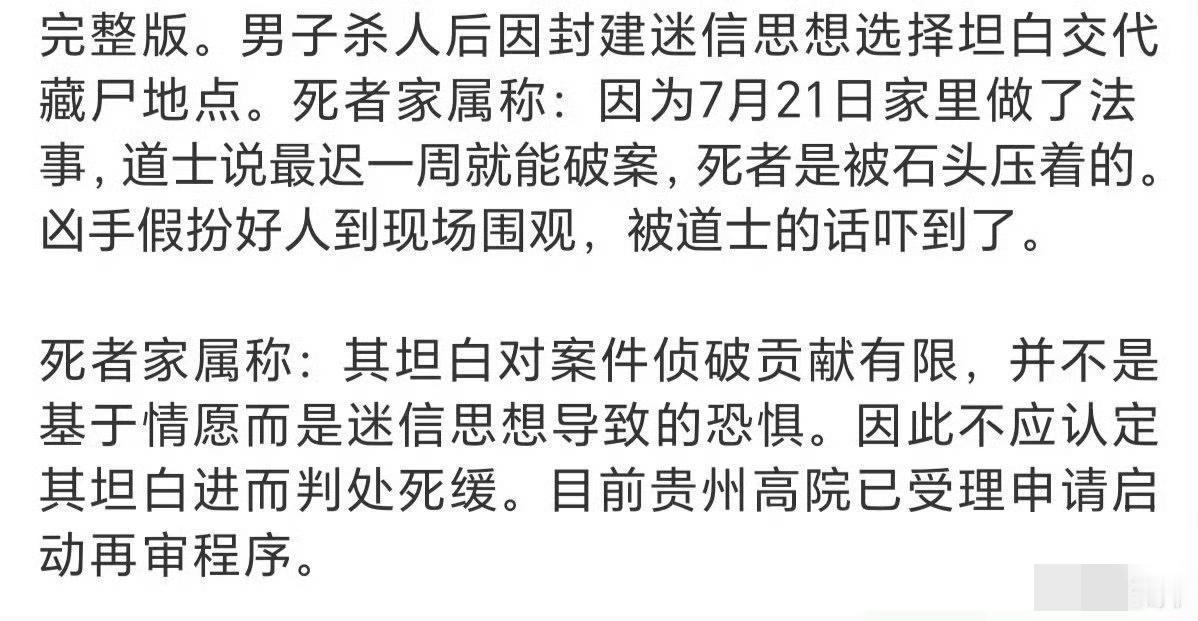 我去!这道士有点东西啊! 贵州49岁农妇拒接60个电话被勒死,凶手装好人帮忙找人还来家吃饭。因为7月21日家里做了法 事,道士说最迟一周就破案,死者是被石头压着的。 竟然精准算出来:尸体被石头压住+一周内破案。 一般尸体被石头压住概率不高,就算猜也很难奔这个方向猜,看来这道士是有点真东西。