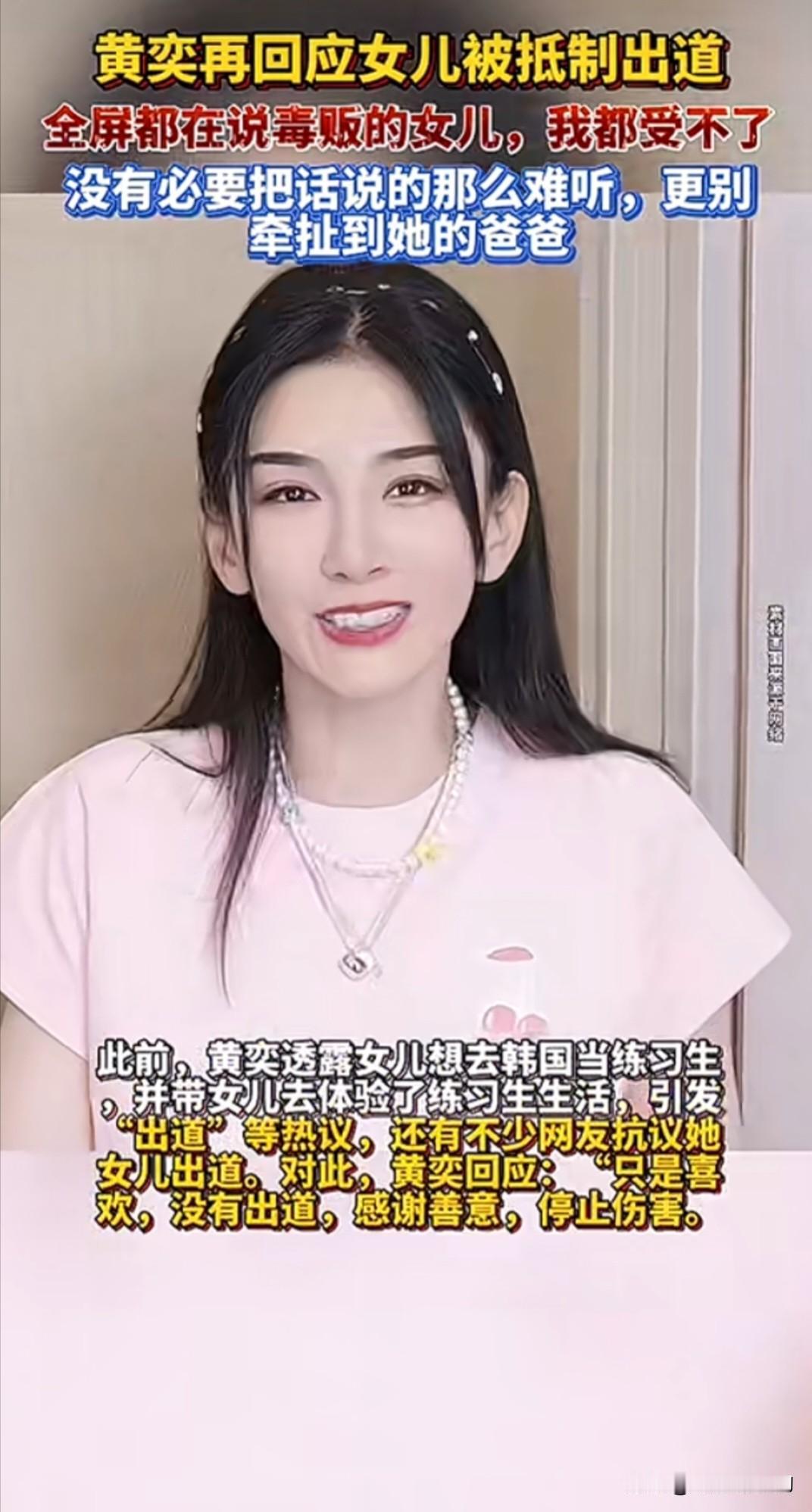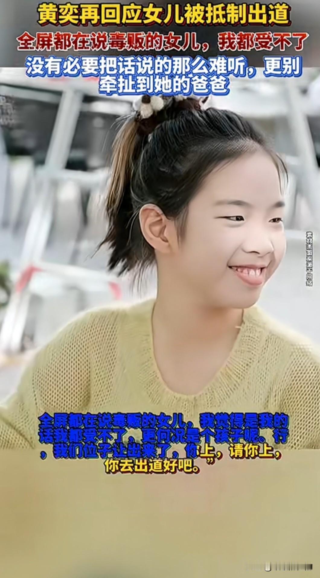 毒贩的女儿想做明星! 黄奕被全网抵制 黄奕因为自己女儿要出道,在直播间怼网友:你行你来啊!我们给你让位置! 这些话惹怒了网友,把他丈夫的黑历史扒出来,毒贩的女儿还要出道! 黄毅清(1985年1月19日-)是黄奕的前夫,上海人,曾创立SSCC上海超跑俱乐部并担任董事长,因贩卖毒品罪和诽谤罪被判处有期徒刑十六年,目前正在监狱服刑。