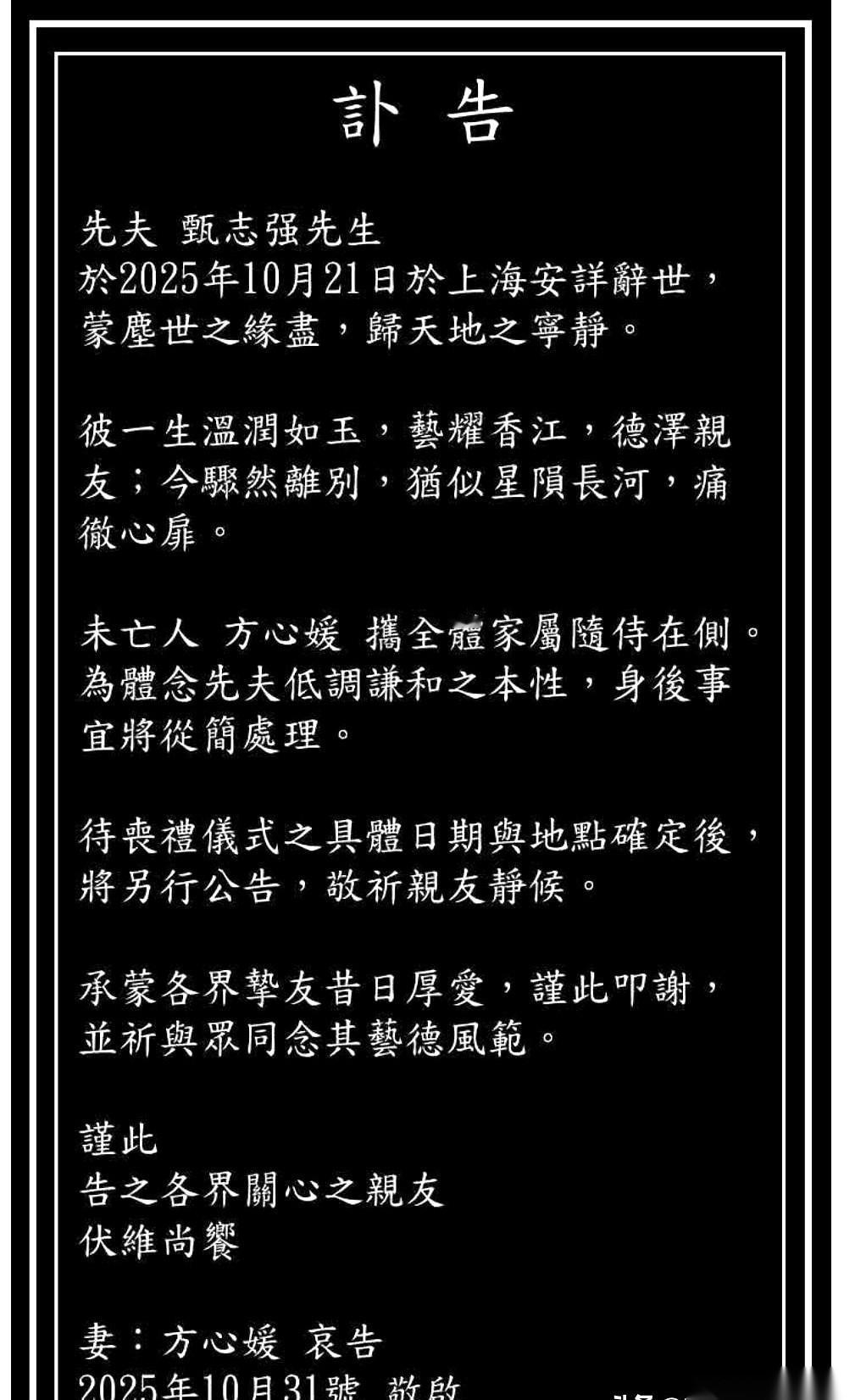 人没了,那些骂他“吃软饭”、嘲笑他“二打六”的陈年烂事,突然就显得特别可笑。 还记得他吗?当年的“最帅展昭”,古装扮相一出来,多少人的白月光啊。 结果呢,就因为谈了个比自己大23岁的恋爱,就被全世界的口水淹死。 什么难听的话都来了。好像一个男人,爱上一个比自己有钱、有名的女人,就是天大的原罪。 压力大到最后,两年感情,散了。 后来,他也想开了,不在这圈子里混了。转头去上海深圳,老老实实做生意,搞餐饮。 你看,人就是这样,总想换个活法,证明点什么。 谁能想到呢,据说就是打个球的功夫,人就没了。 生命这东西,真的太薄了。 他太太发的讣文,写得真好。“温润如玉”,“星陨长河”。 没有一句抱怨,全是克制和深情。 这才是真的爱人。 外面的人怎么看、怎么说,重要吗?到头来,能在你身边,为你写下这几行字的人,才是你的一辈子。 一声叹息。走好。