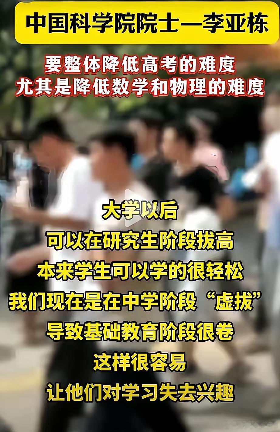 中科院院士认为,现在的高考太准了,而且学习很多都是虚拔,应当降低高考难度,特别是降低数学和物理的难度,因为学生在中小学太卷太拼了,导致他们对学习的兴趣逐步的递减,当他们进入大学之后,他们就会想放松,而青年时期是最容易出成果的时候,所以这个时候应该是对学习保有强烈的兴趣,才容易出科研成果。但是现实却往往相反,很多大学生由于中小学学习用力过猛,导致他们对学习的兴趣锐减,进入大学之后,每天窝在宿舍打游戏,煲电话粥,就是不看书,不学习,到考试的时候搞个突击,学习成绩一塌糊涂,科研成果完全没有,把整个教育都搞反了。这就是中国教育的现状。确实如此,大多数学生中小学生时期用力过猛,以为到了大学就可以轻松了。所以当这些人进入大学之后,他们想的不是如何更加刻苦的去学习,而是如何把自己十多年没有得过的休息如何补回来。[哼][哼][哼][哼][左哼哼][允悲][允悲][允悲][允悲][允悲][允悲]