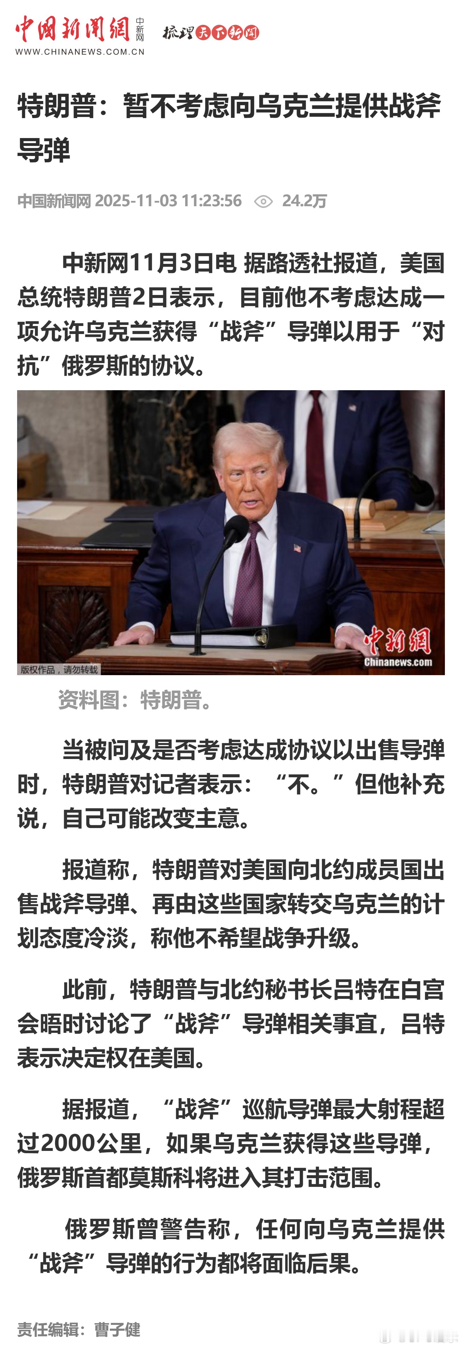 特朗普:暂不考虑向乌克兰提供战斧导弹