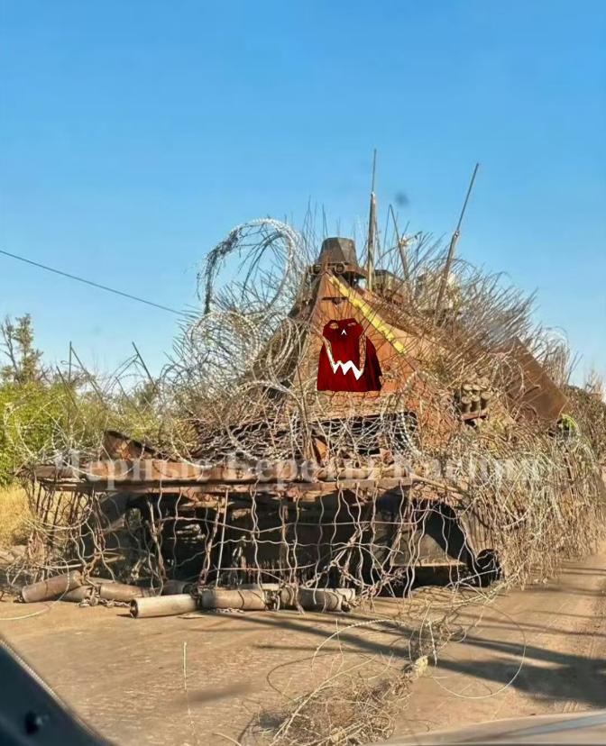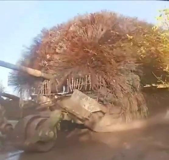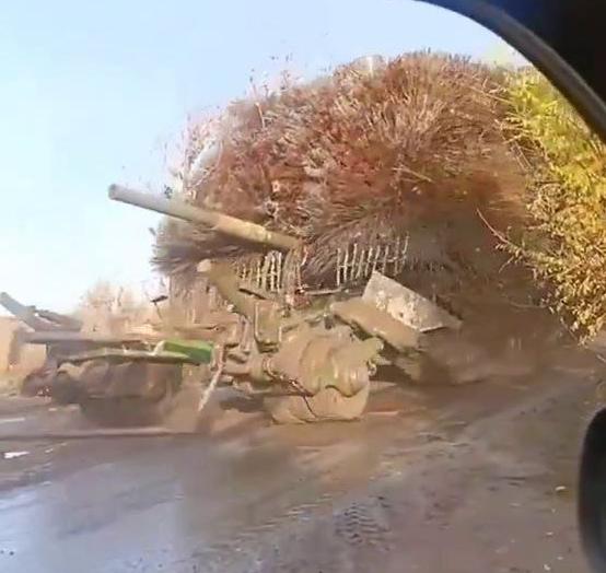 当地时间11月2日,俄罗斯军工改造了一辆T-80BVM坦克,这已经不能叫刺猬战车,蛆虫战车了,应该叫“幻影”坦克。面对着俄军“幻影”坦克,估计乌军官兵肯定表示:“什么叫做一团灌木丛正在向我们的阵地推进,FPV自杀穿越机还打不停?什么叫灌木丛开炮了?”完整版的野战坦克,参考狙击手的野战装,以前就应该出现了。至于吃瓜群众基于传统审美的成见,在俄乌实战中,已经不可取。 俄军改造的“幻影”坦克,把中国军迷熟悉的“幻影”坦克,从游戏走进了现实,真是给中国军迷带来了惊喜。按照游戏里,俄军“幻影”坦克,应该按住ctrl再点左键,直接“隐身”,又如何应对?只能把地图里的大树,都炸一遍。 俄军改造的“幻影”坦克,大量的树枝能提前引爆FPV自杀式穿越机的电线碰炸引信。俄军“幻影”坦克最顶上那是反无人机干扰器。就是一种又科技又原始的感觉。对于坦克来说,隐蔽也没用,进攻时候还是容易被发现,速度也没用,就这种刺猬乌龟一样的,能抗无人机炸。对于俄军坦克来说,在俄乌战场上,活着才是硬道理。21世纪还能见到这么复古的东西,差点以为是cosplay,结果还真是俄军实战化坦克设计。这样不影响坦克的观瞄火控系统吗?命重要,再整个无人机带路,这个时候,坦克观瞄系统已经不重要了。3年前谁敢预测坦克会发展成这个样子,绝对是穿越者。如果乌克兰军队发射标枪反坦克导弹,没有串联战斗部也没用,再就是如今俄乌战场FPV自杀式穿越机泛滥,乌军反坦克导弹小组已经很难顶着俄军无人机,FPV自杀式穿越机巡逻抵近坦克了,除非本来就在那里。 俄军“幻影”坦克还真能防美国标枪反坦克导弹,俄军“幻影”坦克炮塔上面,有很多焊的多层钢筋和钢绳,可以提前引爆标枪反坦克导弹,减少对俄军“幻影”坦克装甲的杀伤力。