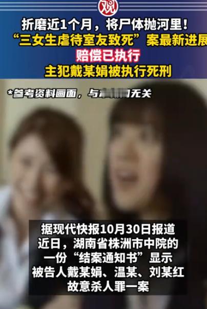 湖南长沙,一00后女孩和另外2个姑娘以及一名小伙子合租了一套房,四人多次在宿舍参与一位女室友组织的赌博。期间女孩输了很多钱,也写下了很多欠条。由于女孩无力偿还,女室友就长期折磨和暴力虐待女孩,直至其器官衰竭死亡。后女室友担心事情暴露,联合另外两位室友将女孩抛尸河中,直到半个月后,女孩的尸体才被发现,至此室友们的暴行也被揭露了出来。 黄某,一个00后女孩,原本只是为了方便在市中心打工而与戴某、刘某以及温某合租,但她万万没有想到,这一屋的合租生活会变成噩梦的开端。 戴某是个性格外向的人,总喜欢把事情掌握在自己手里。刚开始的时候,她只是拉着大家打麻将消遣时间,四个人围坐在桌旁,一边聊天一边碰牌。 那时候大家都很放松,打麻将只是为了打发无聊的夜晚,有说有笑,黄某也会时不时开开玩笑,说自己手气差运气总是输,但总能轻松带过。 可渐渐地,戴某把消遣变成了赌博。每次打麻将,她都会开口“加点赌注吧”,说得轻描淡写,像是在开玩笑,可黄某总是被逼着多下几次。 输了钱,她就要写欠条,那些小小的纸条一张张叠在一起,越来越厚。 黄某写欠条的时候,曾经试着顶撞戴某,想让自己摆脱这种困境,换来的是戴某言语上的侮辱。戴某喜欢在黄某耳边嘲笑她的无能、轻蔑她的家境、贬低她的人格。 每一句话都像针刺般扎入黄某的心里,让她在夜里辗转反侧,无法入眠。黄某尝试忍耐,心里不断重复:“忍一忍,或许就能熬过去。”但随着时间推移,暴力从言语升级为行动。 铁管、木棍、热油和开水,这些在日常生活中本不该出现的物件,成了戴某折磨黄某的工具。 每一次击打、每一次烫伤都像是在黄某身上刻下无法抹去的印记,她的皮肤布满淤青与疤痕,疼痛像潮水般一波波冲击她的神经。 黄某的哭喊声在夜里回荡,但戴某的眼中没有一丝怜悯,甚至带着冷酷的满足感。 黄某的绝望不仅来自身体的痛苦,更来自心理的恐惧。戴某会在深夜扼住她的脖子,用电线勒紧,让她感受呼吸的每一次困难。 她会被关在寒冷的房间里,长时间忍受饥饿和寒冷。每当黄某提出去医院治疗伤口,戴某就像嗜血的猎人一样阻止她,她的求救总是被无情压制。她的身体逐渐衰弱,精神也被彻底摧残。 温某和刘某也卷入其中,他们协助戴某控制黄某,夺走她的手机,隔绝她与外界的一切联系。 黄某开始产生幻觉,房间的阴影像怪物般逼近她,她的心里不断重复一个念头:“我可能再也见不到阳光了。” 每一次试图挣脱,她都被无情地压回现实。她的呼吸越来越急促,身体的疼痛像烈火一样蔓延全身,但她的声音无人回应,她的痛苦无人知晓。 最终,黄某的身体不堪长期摧残而衰竭,她失去了最后的反抗力。死亡的阴影笼罩着她,而施暴者却未有丝毫悔意。为了掩盖罪行,三人合谋将她的尸体抛入河中,希望彻底抹去一切证据。 半个月后,河水将她的遗体冲上岸,冰冷的河面和尸体的僵硬,揭开了这场残忍噩梦的真相。 警方迅速介入调查,现场血迹斑斑,家具破碎,烫伤和打击留下的痕迹昭示着长期暴力的存在。 戴某、温某和刘某最终被抓获,在面对铁证如山时,他们无法辩解,只能承认自己对黄某的折磨及致死行为。 社会震惊之余,也引发了广泛关注:年轻群体的心理健康、赌博与暴力的潜在风险、合租生活的安全问题,都成为舆论讨论的焦点。