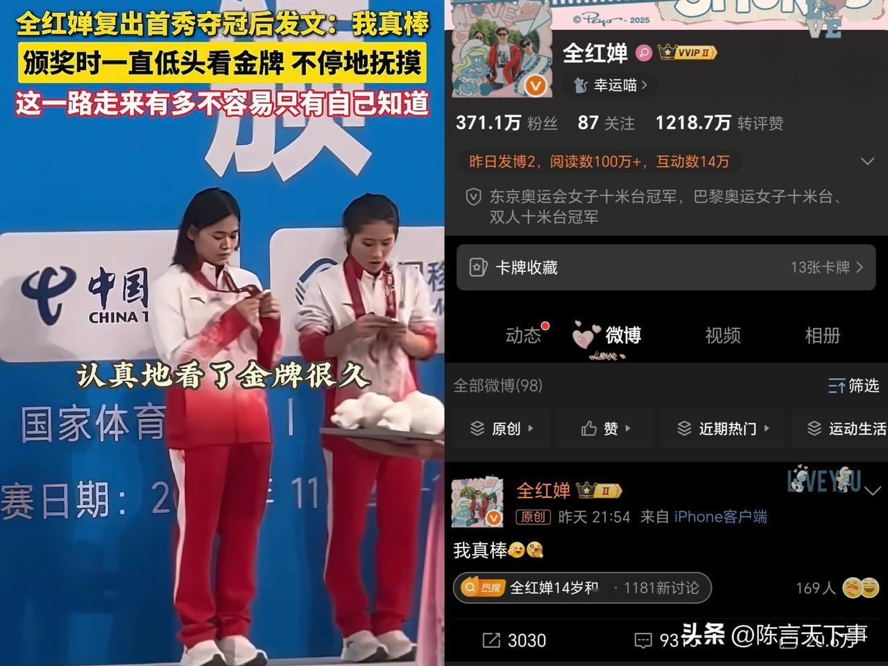 全红婵复出夺冠后,她有两个细节出卖了自己! 一个是她拿到金牌后凝视了很久,反复
