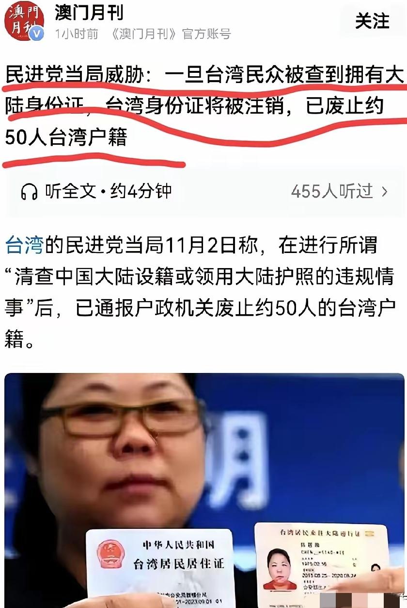 大陆用一个身份证就把民进党吓得如临大敌! 台湾同胞申请大陆身份证,不过是想享受出行、工作的便利,更是认同自己中国人的身份,这本是再正常不过的选择。可民进党偏要跳出来搞事情,注销50人的台湾户籍,还威胁私信举报者要判7年以上,简直离谱到没边。 说白了,他们怕的不是一张证件,是怕越来越多台湾同胞看清统一的大势,戳破他们“台独”的谎言。这种拿民生当筹码、阻碍两岸交流的倒行逆施,根本是在违背民心。 两岸同胞血浓于水,岂是一张禁令能隔开的?你觉得民进党这些小伎俩,真能挡得住统一的脚步吗?