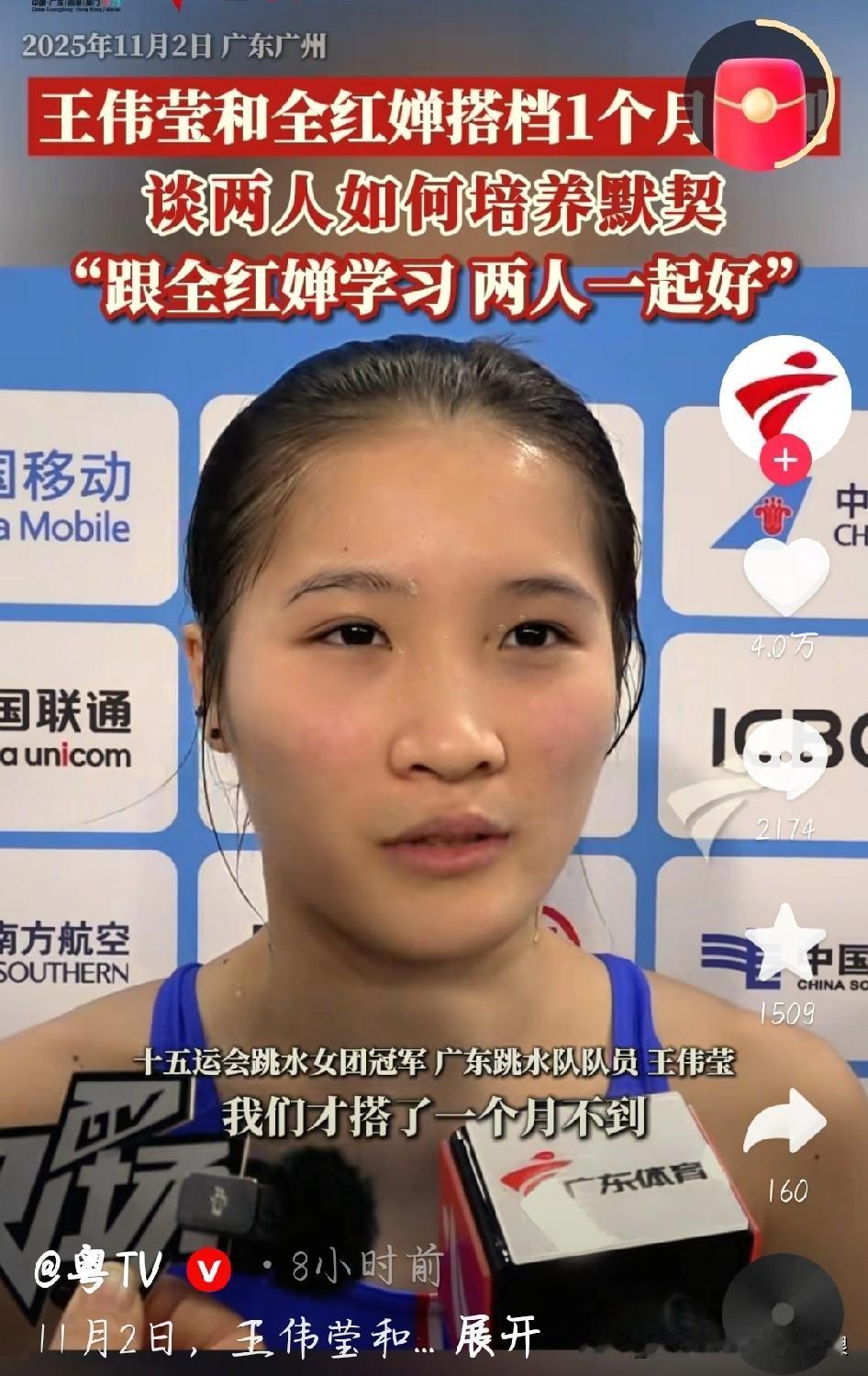 谁能想到,全红婵和王伟莹那“像照镜子”的同步跳,是搭伙不到一个月练出来的?王伟莹赛后的话,可比金牌本身还戳人。 她说压力大到不敢洗头,一洗就掉20根头发——毕竟搭档是奥运冠军,总怕自己拖后腿。但这压力没变成隔阂,反倒是18岁的全红婵主动凑过来聊动作细节,教她怎么调节奏,累的时候还会说“相信自己,尽力就好”。 哪有天生的默契?不过是厉害的那个不藏私,想跟上的那个肯拼命。一个主动带节奏,一个努力追步伐,三周多时间就练出了能赢陈芋汐组合0.9分的实力。王伟莹说全红婵满身都是可爱的点,可她自己咬牙扛压力的样子,同样让人佩服。 双人跳水比的是同步,更是真心换真心。这对新搭档,未来太让人期待了!全红婵 跳水冠军婵 全红婵传奇人生 全红婵新搭档