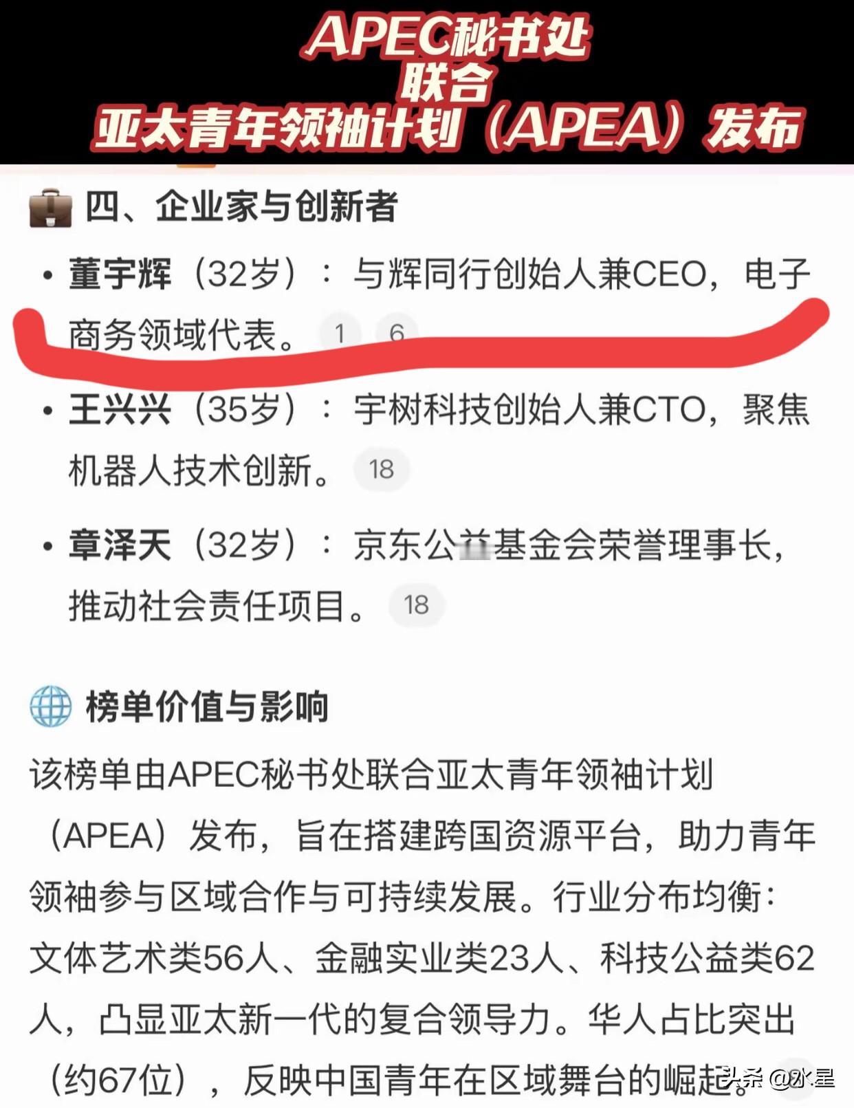 董宇辉入选亚太青年领袖榜单了 他跟宇树机器人的王兴兴以及京东章泽天 同属于企业家与创新者代表阵营 这个榜单主要表彰35岁以下的青年领袖 他们对推动地区经济和社会发展 起到了非常重要的积极作用 这个榜单还是挺权威的 是APEC框架下的重要评选 今年一共有141位代表,华人占67位 而董宇辉名列其中 他带着与辉同行 用短短不到两年时间 就获得了国际认可 真的是忍不住跟着骄傲 我们彪哥实在太优秀了[耶][赞] 宇辉这么忙 知道这个消息不[大笑]
