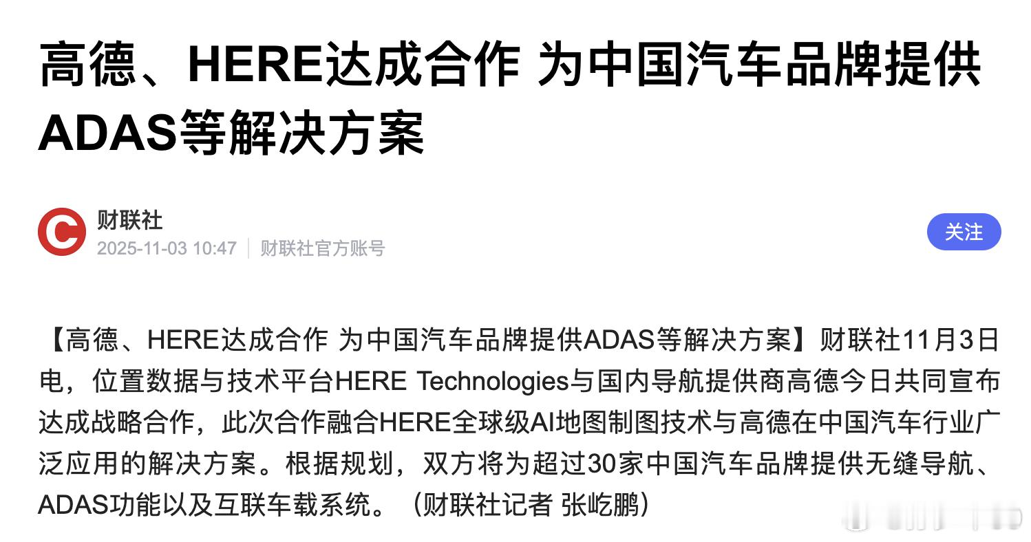 此次合作融合HERE全球级AI地图制图技术与高德在中国汽车行业广泛应用的解决方案。根据规划,双方将为超过30家中国汽车品牌提供无缝导航ADAS功能以及互联车载系统。