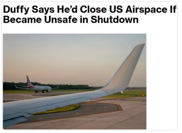 【美国政府停摆可能导致美国航空旅行瘫痪——彭博社】美国交通部长肖恩·达菲表示,如果预算危机导致飞行不安全,他准备关闭美国领空。 美国联邦航空管理局目前空中交通管制员短缺,而且许多管制员都是无偿工作的。 混乱之中,周五有超过6200个航班延误,近500个航班取消。