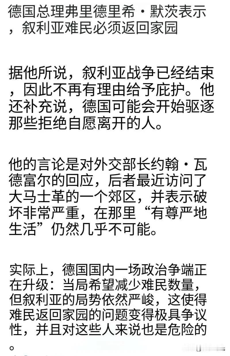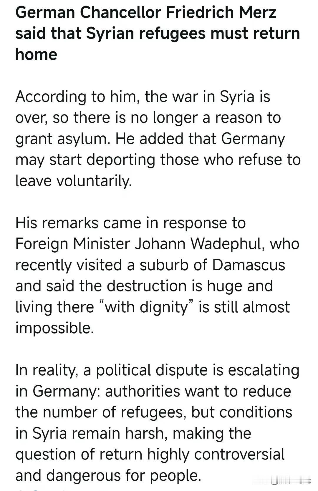 德国总理弗里德里希·默茨表示,叙利亚难民必须返回家园。 他表示,叙利亚战争已经结束,因此不再有理由给予庇护。 他还补充说,德国可能会开始遣返那些拒绝自愿离开的人。 他的这番言论是对外交部长约翰·瓦德普尔的回应。 瓦德普尔最近访问了大马士革郊区,并表示那里的破坏非常严重,在那里“有尊严地”生活仍然几乎是不可能的。 事实上,德国正在发生一场政治争端:当局希望减少难民人数,但叙利亚的局势依然严峻,使得难民返回问题极具争议性,并且对人们来说十分危险。