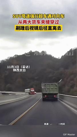 惊!SUV弯道强行超车,在两大货车夹缝中“生死穿越”,目击者:几公分距离,太吓人了! 11月3日陕西太白的一段公路上,一辆SUV的操作让人心提到了嗓子眼。在弯道处,它不仅没减速,反而加速强行超车,径直冲向对向车道,在红色大货车和另一辆货车的狭小夹缝里硬穿了过去,间距估计就几公分,剐蹭了后视镜后就直接跑了。 好在红色大货车司机反应够快,及时向右打方向还紧急制动,这才没让事故升级。 目击者祝先生直言:“当时感觉就要出事,那小车就跟在刀尖上跳舞似的,多亏了大货车司机,不然真不敢想。” 这种拿生命当玩笑的危险驾驶,实在是让人捏一把汗。