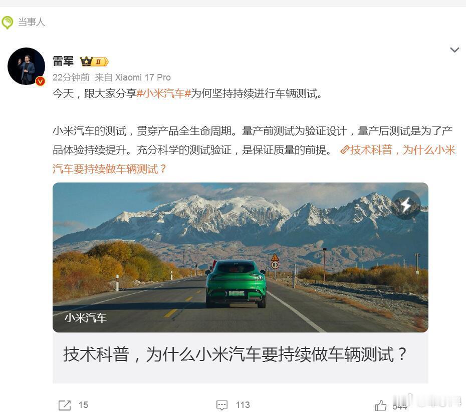 雷军谈为何小米汽车持续进行车辆测试