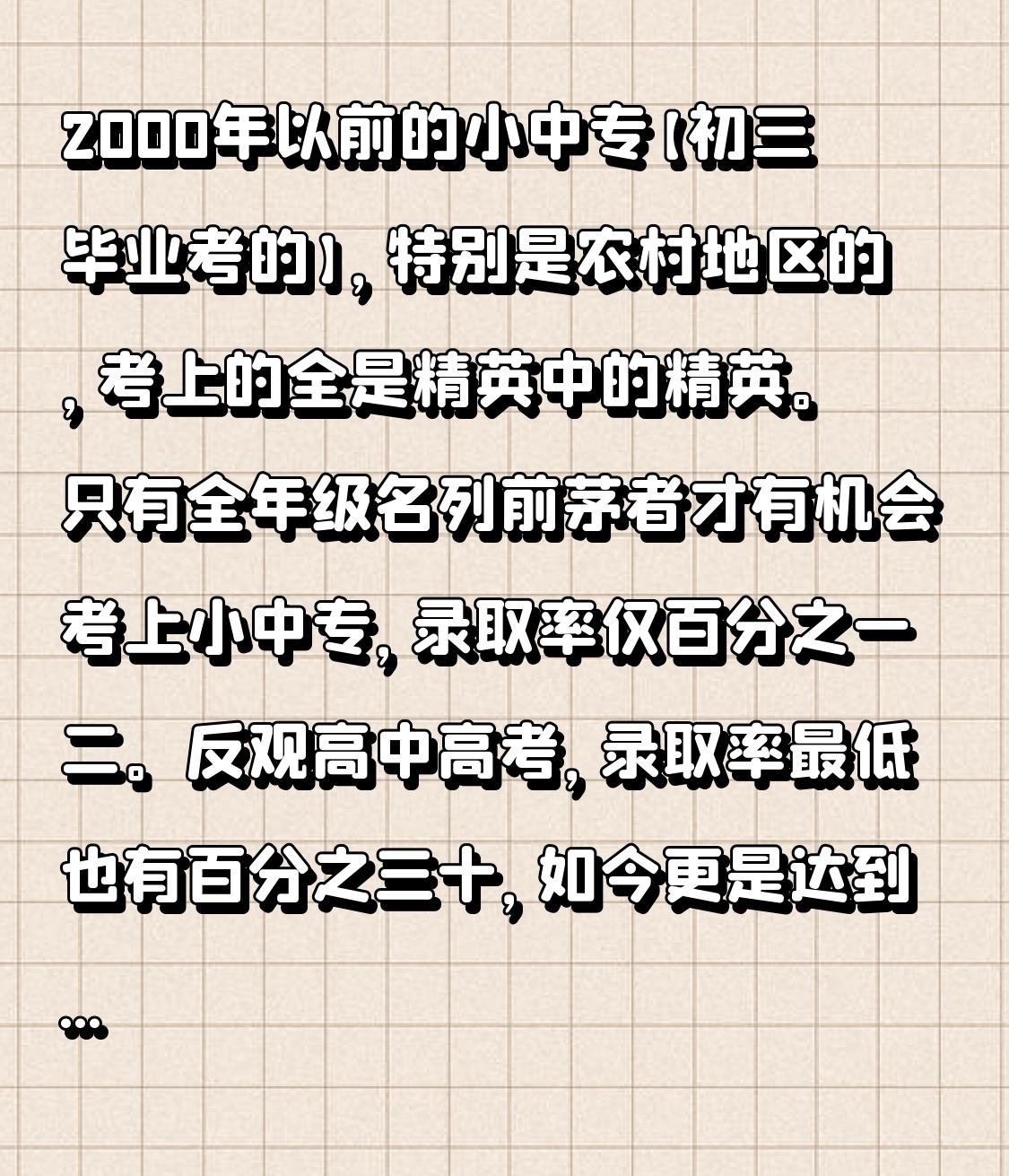 小中专比985金贵,2000年以前的小中专【初三毕业考的】,特别是农村地区的,考上的全是精英中的精英。只有全年级名列前茅者才有机会考上小中专,录取率仅百分之一二。反观高中高考,录取率最低也有百分之三十,如今更是达到了百分之七十。这便是差距所在。 比985还金贵,一点不为过。也是严重的浪费人才,小中专上学回来都是工人。