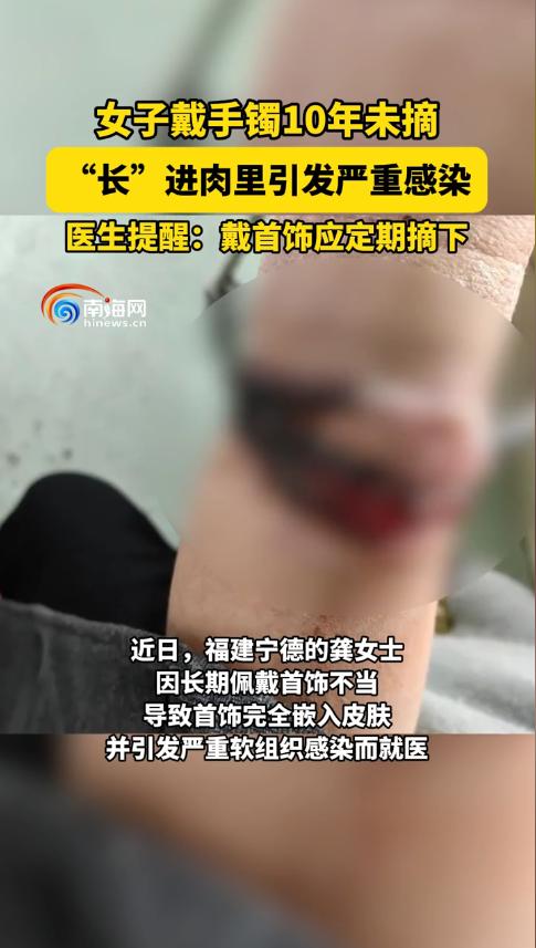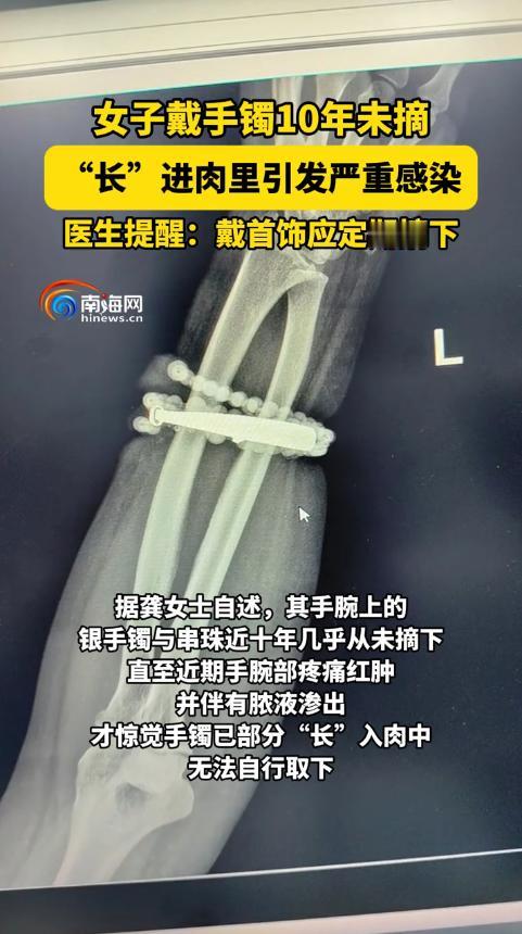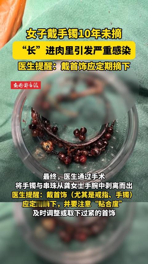 “离了个大谱!”福建宁德,一女子手腕上的首饰,10年几乎没有摘下来过,由于体重的变化,她最近一直感觉手腕疼,有时还有脓液流出,这才发现首饰已经嵌入肉里!于是女子立即前往医院取出,医生表示若再晚些可能影响前臂功能。 戴首饰千万别太 “执着”! 福建宁德龚女士(化名)的经历,看完浑身发麻! 医生拿着手术取出的银手镯和念珠,直言:再拖几周,前臂功能可能就受影响了。 事情要从十年前说起,龚女士买了这对手镯和念珠后,几乎就没摘下来过。 一开始戴着刚好合适,她也越戴越喜欢,觉得是个念想。 可这十年里,她的体重慢慢增加,手腕也跟着变粗。 手镯是固定尺寸的,随着手腕变粗,首饰和皮肤之间的空隙越来越小。 一开始,她只是觉得手腕偶尔有点痒。 以为是皮肤干燥,或者有点小皮炎,压根没当回事。 可后来,瘙痒变成了持续性的红肿,甚至开始渗液、流脓。 这时候龚女士才慌了,赶紧去医院检查。 医生一看到她的手腕,就知道情况不简单。 首饰已经部分嵌进了皮下组织,周围全是炎症和感染的痕迹。 当天就安排了局部手术,清创、取出金属物,还做了抗感染处理和缝合。 主刀医生说,幸亏来得不算太晚。 要是再拖延,炎症会沿着筋膜扩散,甚至损伤肌腱和神经,影响手指活动。 其实这种 “首饰嵌进肉里” 的情况,临床上并不少见。 大多是长期戴固定尺寸的戒指、手镯,遇到体重变化、局部水肿,或者皮肤长期摩擦增生导致的。 而且金属和汗液接触,还可能引发过敏,细菌趁机入侵,就容易化脓感染。 给喜欢戴首饰的朋友们提几个关键提醒: 第一,不管多喜欢的首饰,都要定期摘下来,检查皮肤情况。 只要出现瘙痒、发红或者皮肤凹陷,立刻停戴,赶紧去看医生。 第二,尽量选可调整尺寸或者开口式的首饰,别长期戴固定大小的。 第三,材质很重要,敏感体质优先选医用不锈钢、18K 金这种低过敏的。 第四,体重波动大、怀孕,或者服药容易水肿的时候,千万别长期戴紧箍类首饰。 第五,要是发现局部疼痛加重、流脓,甚至发烧,马上就医,别自己瞎折腾。 网友们看了也议论纷纷:“戴十年不摘,也太能忍了吧”。 也有人说:“生活太忙,真的容易忽略这些小变化”。 其实这也提醒大家,再忙也要多关注自己的身体。 家人之间也可以互相留意,遇到异常及时提醒。 漂亮的首饰是为了给生活添彩,不是为了给身体添堵。 定期检查、选对材质、该摘就摘,才是对自己负责。 你们有没有长期戴首饰的习惯? 遇到过类似的麻烦吗? 对此,你有什么看法呢? 信息来源:杭州网