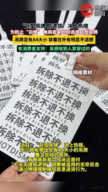 还在为“白嫖党”头疼?电商商家放大招,A4巨型吊牌让退货“社死”又无奈 还在为“白嫖党”头疼?电商商家祭出A4纸大小的巨型吊牌,让你想退都“社死”! 近日,“巨型吊牌 防退货”冲上热搜。巴掌大的吊牌穿在身上显眼到尴尬,商家这波操作只为对抗恶意退货。有消费者直言:“真反感收到别人穿过的!”可商家也是无奈,“七天无理由”被滥用成了“七天无理由白嫖”,只能靠这物理限制来设防。 一边是商家对恶意退货的无奈反击,一边是消费者对二手货的本能抵触,这场消费博弈里,巨型吊牌是无奈的盾牌,也是电商退货乱象的一个缩影。
