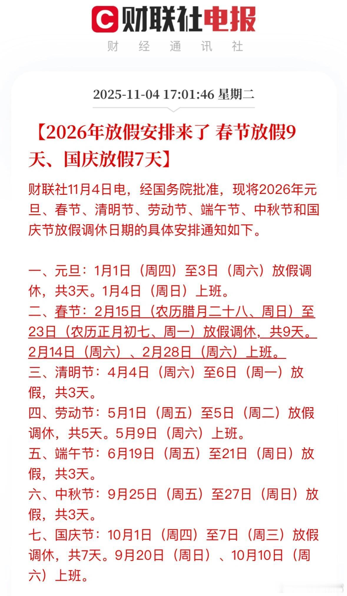 时间过得真快呐,2026年节假日安排出来了,给大家汇总下吧,元旦放3天、春节放9天、清明放3、劳动节放5天、端午节放3天、中秋节放3天、国庆节放7天。最大亮点就是2026春节放9天假,堪称史上最长春节假期,只不过会碰上调休,这放假安排大家满意吗[流鼻血]