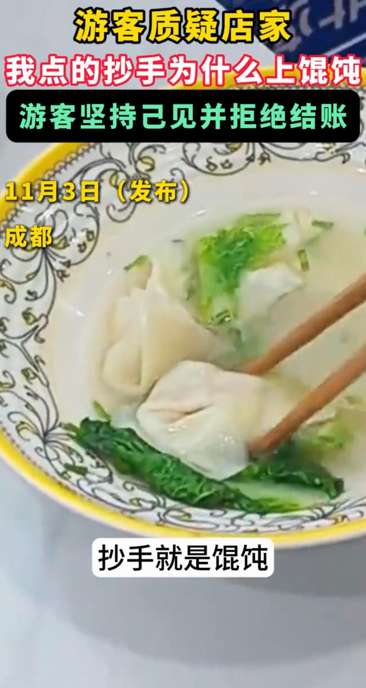 “这下真的解释不清了!”四川成都,女子吃完饭不给钱,非说自己点的是抄手,店家端上来的却是馄饨,店家是有苦难言,只能一遍一遍跟女子解释。 女子都把一大碗吃的差不多了,就剩下两三个“抄手”还在碗里,但她非说这就是“馄饨”。 无奈之下,店家只能跟女子解释,其实抄手就是馄饨,馄饨就是抄手,它俩只是不同的叫法一样。 但女子却感觉店家在糊弄自己,因为她中午在另一家店吃了抄手,她觉得那家店的抄手和这家的完全不一样,肯定不是同一个东西。 眼看有理说不清,店家只能让女子投诉自己,到时候究竟该不该给这份钱,自有公论。 有江苏网友纳闷,这俩到底有什么不同,谁解释一下。 有四川网友说,抄手和馄饨就是一回事,除了饺子他俩都一样。 我看完觉得,这店家是真的冤枉啊。其实抄手、馄饨、云吞还真就是同一个东西,四川叫抄手,是因为包的时候两个手要来回交叉。广东人叫云吞,其实是粤语“馄饨”的谐音,真没什么本质上的区别。 更何况女子一碗都吃的差不多了,这个时候非说上错了,那她早干嘛去了?