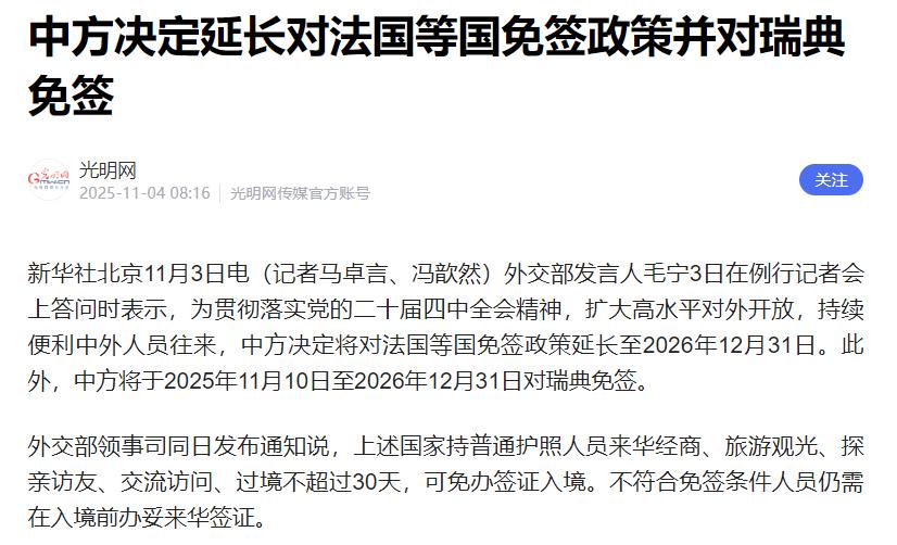 中国与瑞典关系破冰,这是否意味着欧盟对中国免签更近了一步?   据外交部11月3日发布的公告,中方决定从2025年11月10日起至2026年12月31日,对瑞典公民实施单方面入境免签政策。   这意味着瑞典人持有效护照来华旅游、商务、探亲等短期访问,最长可停留15天,不用再提前申请签证,而这一举措被外界视为中瑞关系回暖的重要标志。   此前,中瑞两国在相当长的一段时间里,在一些领域存在过分歧。有调查显示此前超过70%的瑞典民众对中国社会制度存在误解,这种认知偏差曾给双边交流带来阻碍。这次免签政策的落地,相当于给双边关系注入了一剂强心针,也为中欧之间的人员往来搭建了新的通道。   事实上,中方此前已对法国、德国、意大利等30多个国家实施单方面免签政策,其中不少是欧盟成员国,如希腊、葡萄牙等南欧国家因旅游业依赖中国游客,对签证便利化需求尤为迫切。   但要看到,瑞典只是欧盟27个成员国中的一个,欧盟的签证政策可不是单个国家能说了算的。欧盟内部有个申根区签证统一机制,要实现对华免签,必须得所有成员国一致同意才行。   可欧盟本身就不是个完全团结的整体,各个国家在对华政策上的立场差异不小。   比如匈牙利长期与中国保持紧密经贸合作,在多个场合表达过对签证便利化的支持;而部分西欧国家则因国内政策考量,在对华免签问题上始终保持谨慎姿态。   有的国家跟中国经贸往来密切,希望能放开签证方便人员流动;但也有一些国家,受各种因素影响,对放宽对华签证一直比较谨慎。   更深层的问题在于,部分欧盟成员国的极端右翼势力对本国政策有不小影响。这些势力往往在移民、签证等问题上持保守态度,甚至会刻意渲染一些不实信息,给对华签证政策的推进制造阻力。   就以瑞典为例,此前民众对中国的认知偏差背后就有右翼势力渲染的影子;再拿之前的一些情况来说,个别国家因为国内政治因素,在中欧签证谈判中就曾提出过一些不合理的附加条件,使得整体进程一拖再拖。   所以,中瑞免签确实是中欧关系中的一个积极突破,但这并不代表欧盟对华免签就指日可待了。要实现整个欧盟层面的免签,不仅需要更多像瑞典这样的国家发挥积极作用,更需要欧盟各国能够克服内部分歧,摆脱极端右翼势力的干扰,从客观务实的角度看待对华人员往来的重要性。   这注定是一个需要耐心和持续努力的过程,短期内想要实现恐怕不太现实,还得一步一步来。