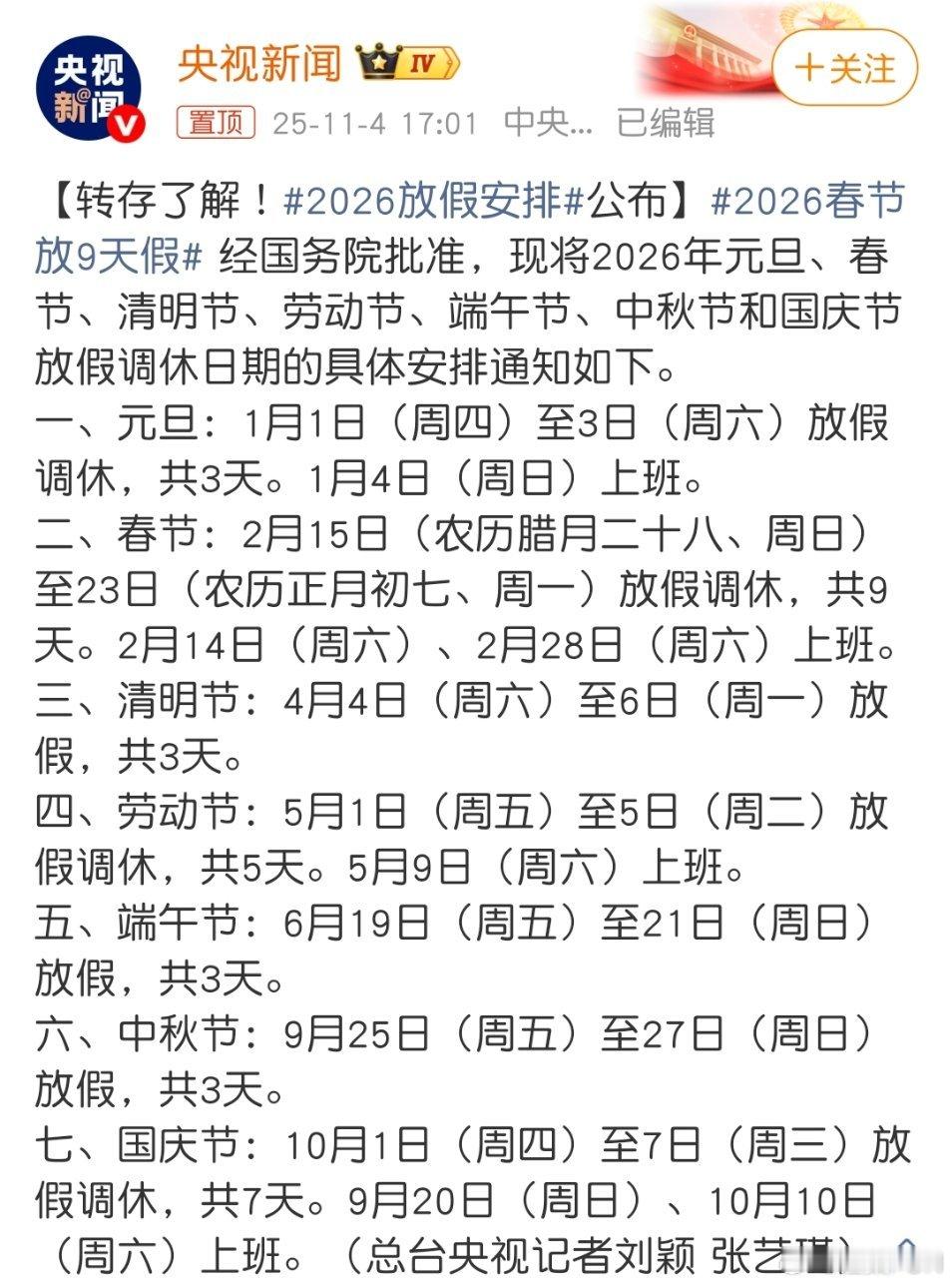 2026春节放9天假帮大家算了下,明年七大节假日,一共是33天,春节连续9天放假,相当舒服!