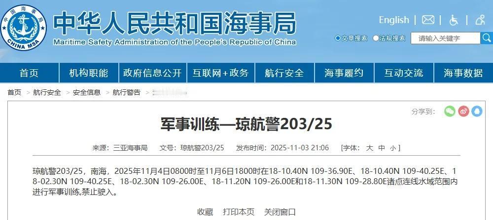 据中国海事局网站消息,三亚海事局发布航行警告,11月4日8时至6日18时,南海部分海域进行军事训练,禁止驶入。