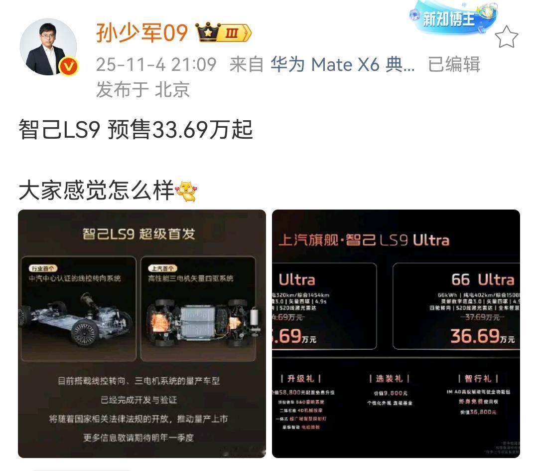 孙少军:智己LS9 预售33.69万起 !目前已经有网友晒单! 这个指导价在正式上市的时候肯定还要再低一点,如今市面上大型suv可选择的项目太多了,这款车相比较其他的竞争对手,还是有自己的特色的。 有一位网友已经晒单了,他已经进行了预定,各位觉得这款车怎么样?欢迎评论区留言。