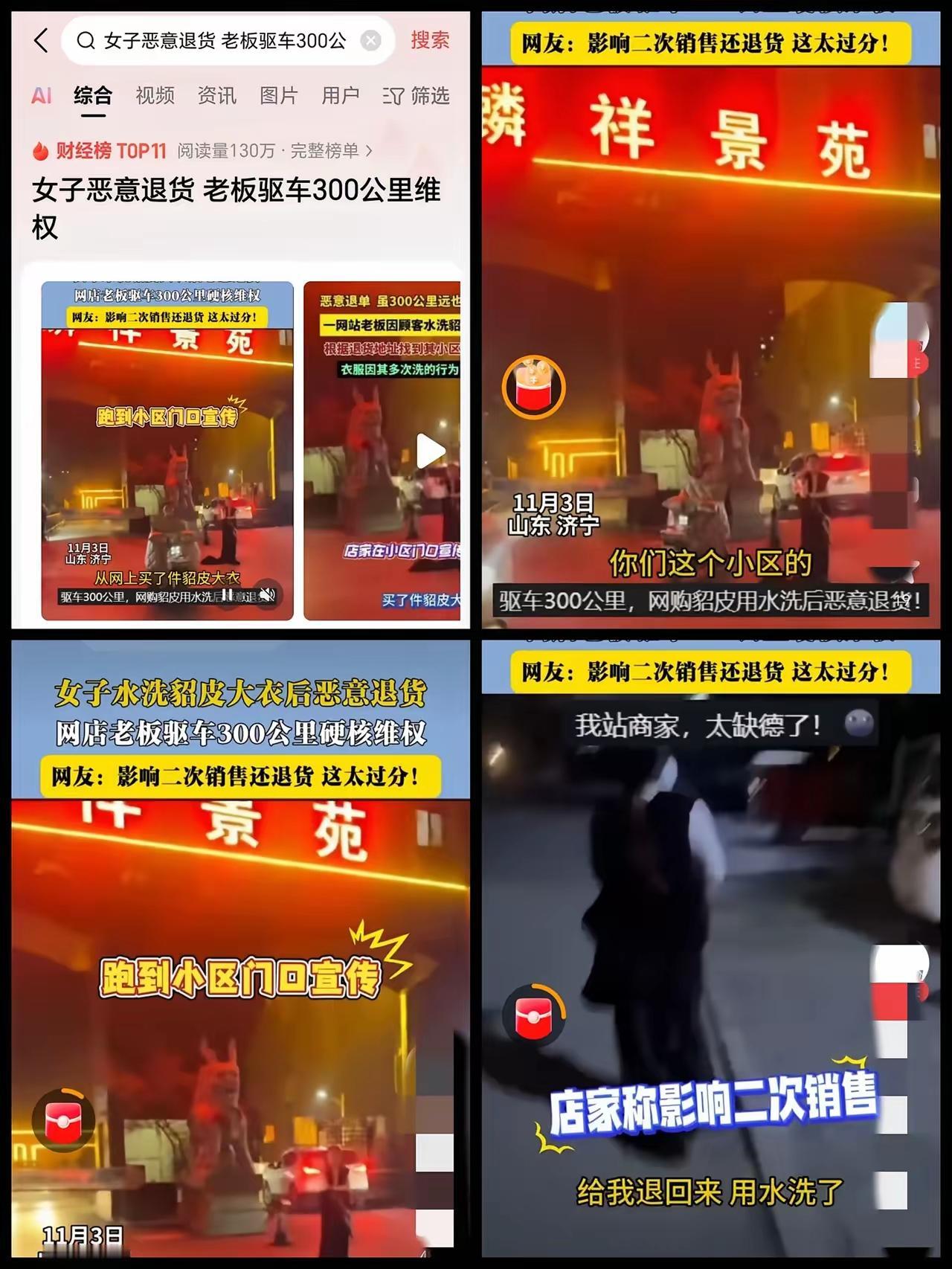 山东济宁的这位宝妈也太社死了吧! ​11月3日,山东济宁麟祥景苑小区门口的电商卖家王女士因宝妈水洗貂皮大衣影响二次销售,气不过,驱车300公里硬刚买家只为讨一个说法! ​2000元的貂皮大衣,因为买家的失误,水洗了,平台竟然同意退货退款,卖家还申诉失败,这事换谁身上都气不过吧,只不过有的人为了继续在平台生存选择忍气吞声,有的人选择硬刚到底。 ​如果是商品质量问题,买家退货情有可原,但是明显的买家自身原因导致的,为何卖家要为别人的失误买单?这一波,平台甩锅有点过分了! ​买家也想不到,有人会选择硬刚到底吧。躲着不见就能解决问题吗? ​明明可以双方私下协商沟通,这下好了,闹的沸沸扬扬,里子面子都没了,何必呢? ​网友评论: ​我妈抖音买的蜂蜜,我嫌弃便宜了不好,运输中点退货退款了,然后给快递员发短信说拒收,结果快递员也没打电话直接送驿站了!我妈又去取了!过了好几天我周末回去我妈告诉我说钱怎么也退了!立马给人家转过去了! ​ ​我这有个山东的某某培训学校的,买了洗发水,说没拆开,她从底部拆的,拧开盖子倒了三分之二,退回来! ​ ​实体店也会遇到这种顾客呀。天刚冷时买的羽绒服,年后暖和穿不着了,来退,说出绒了。不给退就打市场监管的电话,市场监管为了息事宁人让我们实体店忍气吞声的受着。 ​ ​缺德的人多了去了,只不过这件衣服价格高卖家去找爆出来了。我店里十月初一个河北买家买了一件毛衣打底衫,14.1元买的,然后穿了二十几天把袖子给我缝线拆掉来找我退货,说第一次拿出来穿袖子就脱了,我同意给退,然后发过来的衣服一股臭味,也不知道洗了多少次了。太无良。我这都是库存尾货,可以说每件衣服都是低于成本价很多销售的衣服,所以不存在低价劣质一说。同等品质网上正常去买一般要几十块一件。 ​ ​七天无理由退货本来是为网购兜底,现在却成了买家的照妖镜。啥人都出来了! ​ ​都是平台在作恶,还故意装死,把矛盾转嫁给了买卖双方!按金额罚平台100倍,就能杜绝这种事情了! ​