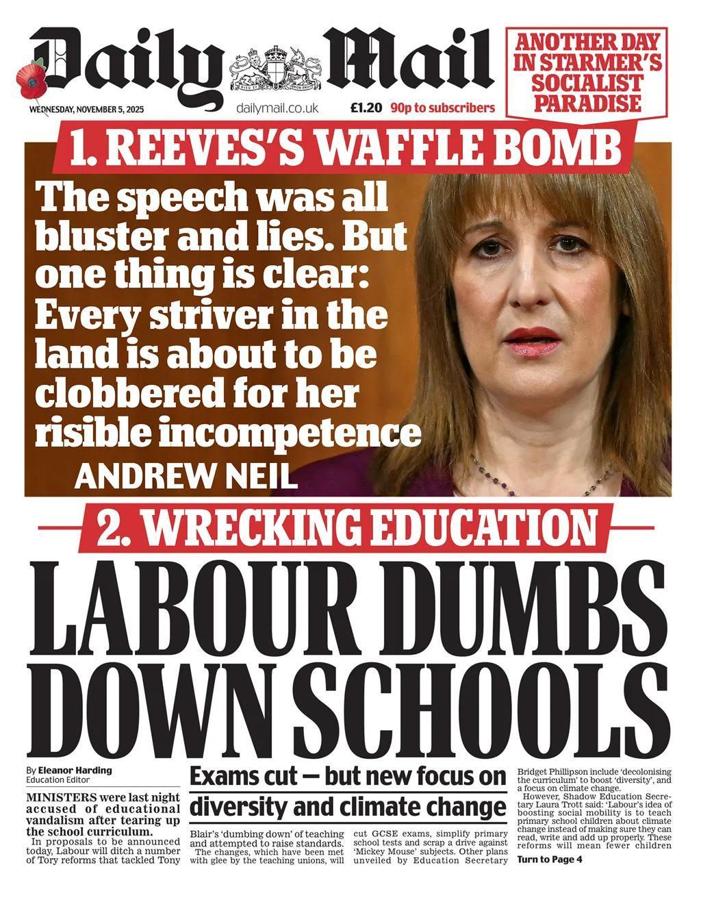 《每日邮报》头版报道,英国财政大臣蕾切尔·里夫斯于2025年11月4日发表演讲,主要内容包括: 演讲聚焦英国经济未来发展方向,强调将通过预算决策为经济奠定坚实基础,并回应长期经济挑战。 削减债务与控制通胀:明确表示将优先降低借贷成本和通胀,暗示工党政府可能调整税收政策以平衡预算。 长期经济规划:提出将重点投资绿色产业、住房建设等领域,但反对通过大规模举债刺激经济。 国际合作:重申与中国等贸易伙伴的经贸关系,强调符合国家利益的合作必要性。 演讲中,里夫斯多次强调决策将兼顾短期稳定与长期发展,并明确回应了市场对预算调整的预期。 《每日邮报》批评这番言论全是大话和谎言。但有一件事是清楚的:这个国家的每一个奋斗者都将因其可笑的无能而受到重创 。 另外该报关注英国工党计划废除保守党在教育方面的改革——包括 GCSE 考试,并简化小学测试。