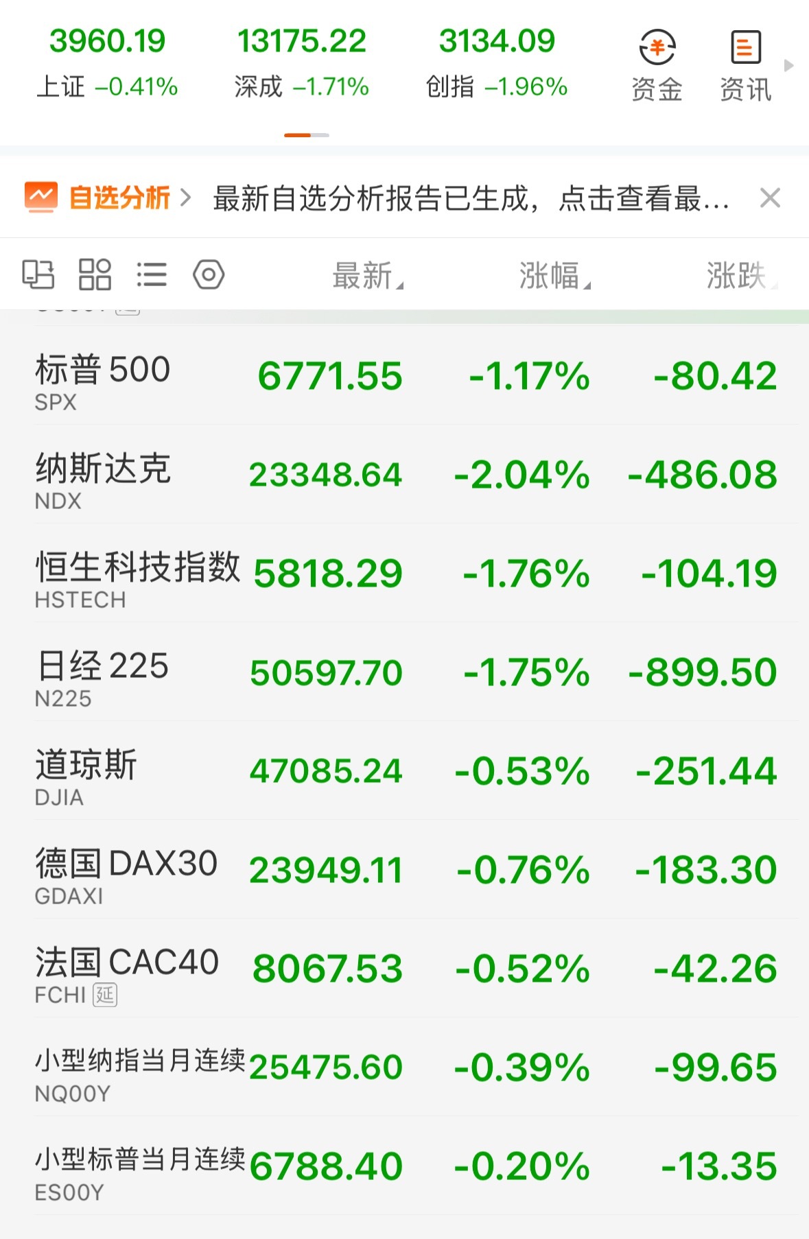 全球市场:美股三大指数全线收跌 纳指跌超2% 英伟达跌近4%,英特尔跌超6%,特斯拉跌超5%,谷歌跌逾2%,亚马逊、Meta跌超1%,奈飞小幅下跌;苹果小幅上涨。