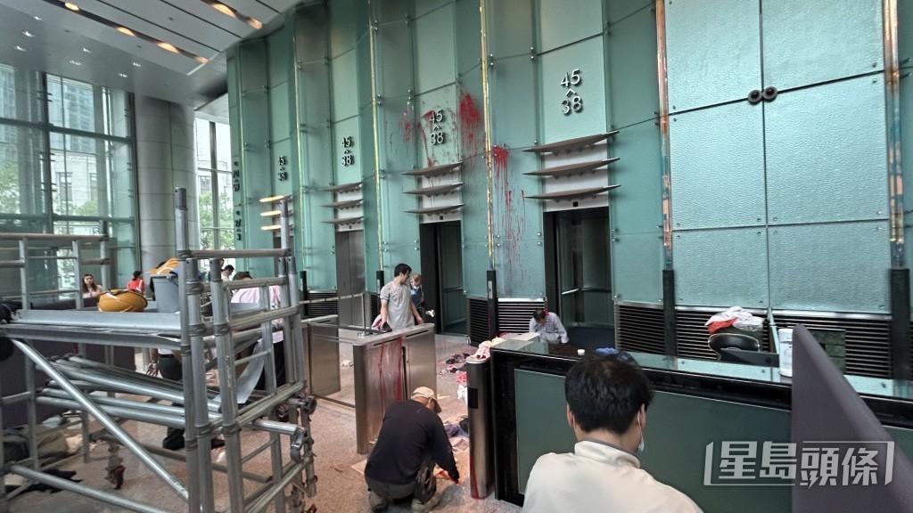 今天上午10点多,一名男子先去大埔买了三罐红色油漆,而后去到中环长江中心接待处,表示要跟李嘉诚会面。 保安员拒绝要求,陈男即以红油泼向上址电梯大堂位置。期间保安员试图阻止被殴,致颈部受伤擦损。其他保安同事报警求助。 警方及救护员到场,以涉嫌普通袭击及刑事毁坏拘捕涉案的49岁姓陈内地男子,案件仍在调查中,受伤保安员则送往玛丽医院治理。 据悉,此男子疑似精神有异,之前曾两次到长江集团中心作出滋扰行为,鑑于今次事态严重,将于明日(5日)向法庭申请禁制令。