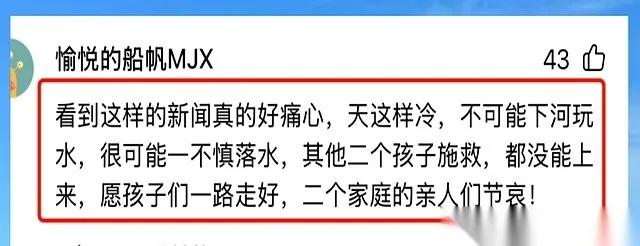 三个孩子在新农村修的河里溺亡,姐姐11岁,弟弟7岁,还有邻居小姑娘,一起到河边玩,没想到发生惨剧。 姐姐弟弟掉进河里,姐姐奋不顾身跳下去救弟弟,也溺亡了。 河岸光滑陡峭,大人都难以自救,更何况孩子。姐弟俩可能是滑倒了,姐姐本能地去拉住弟弟,又掉进河里了。 今年寒冷,河水很冷,估计也就是下滑倒了,姐姐就去救弟弟,姐姐救弟弟也很正常。 姐姐本能地去拉住弟弟,又掉进河里了,这种情况安全教育就失效了。 24年前,我县也发生过三个孩子溺亡的悲剧,当时的孩子和现在的孩子都是同样大的,三个孩子的惨痛教训似乎没有被我们吸取。 我们只改进了河岸的设计,并没有加强孩子们的安全教育。 我们教育孩子禁止下河游泳,没教孩子禁止滑倒下河后怎么自救,也没教孩子禁止溺水后怎么救人。 与其口头宣传,不如在危险河段装护栏,不让孩子下河,不让孩子靠近危险河段,更应该让孩子学会游泳、学会在水中自救、学会如何救人等应对突发事件的本领。 安全措施要可见可触,让孩子看得见、摸得着,不要让孩子走不进的地方,也不要让孩子去碰不得的东西。 宁可麻烦些,也不要留下隐患,让下一代的父母再去担心、后悔、痛哭。 麻烦看官老爷们右上角点击一下“关注”,既方便您进行讨论和分享,又能给您带来不一样的参与感,感谢您的支持!
